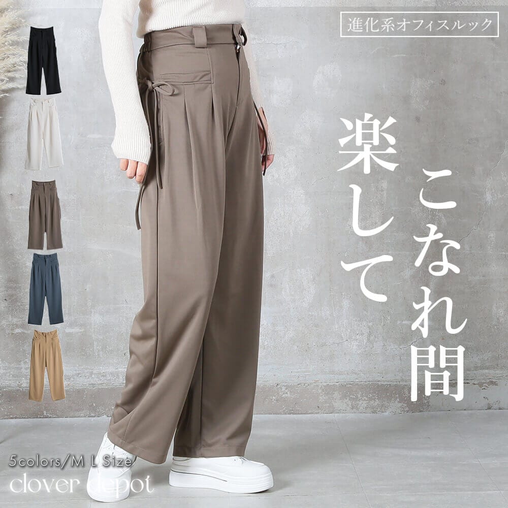 ワイドパンツ リボンタック 体型カバー ゆったり M‑L sizes 5colors