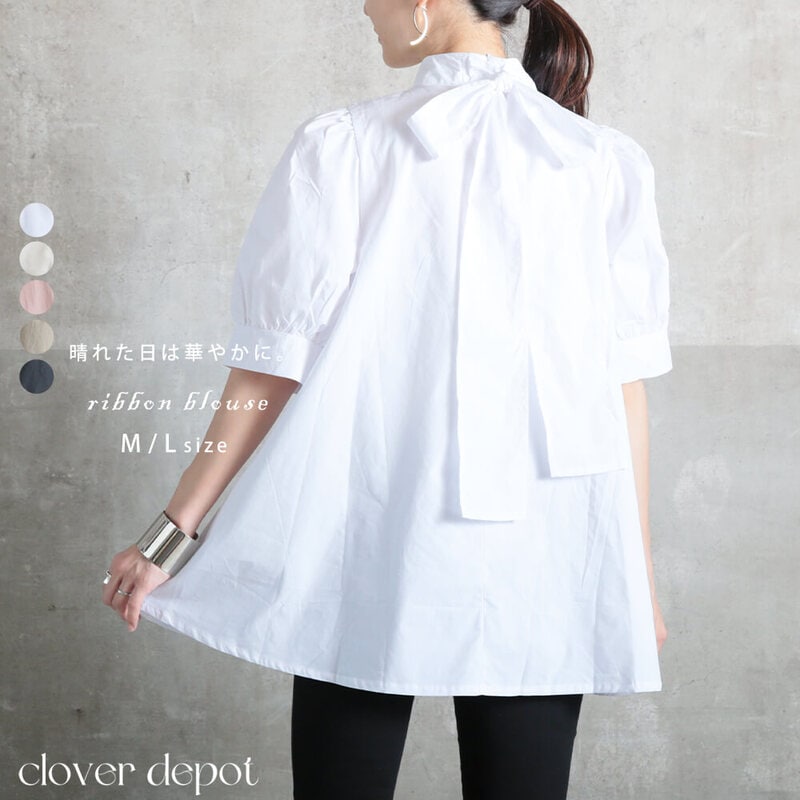 フレア ブラウス パフスリーブ リボン バックリボン シャツ 半袖 5分袖 5color M L サイズ