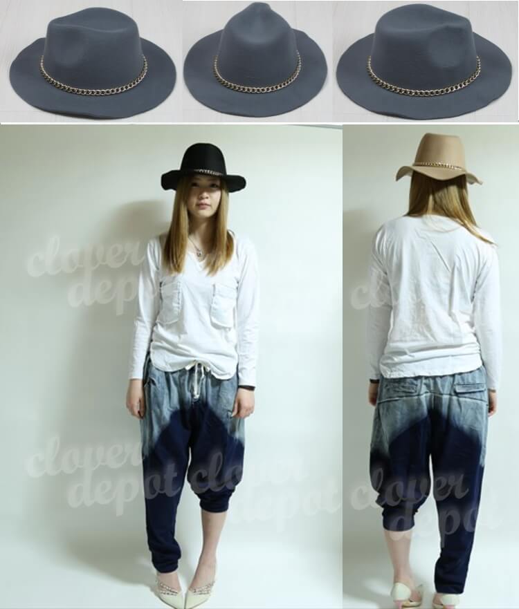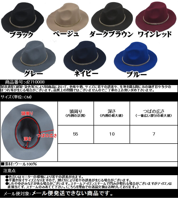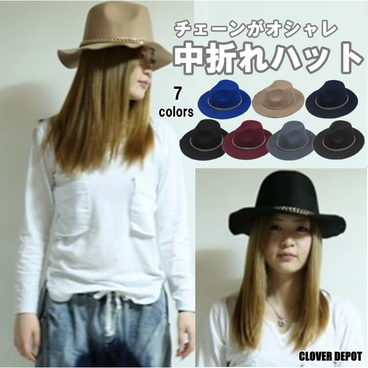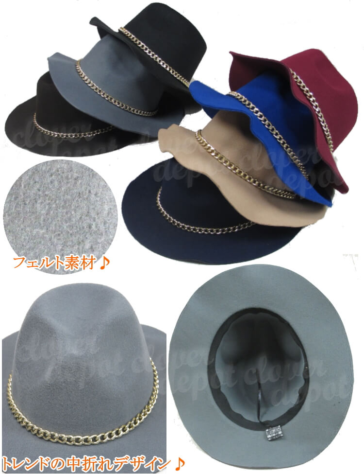 ハット 帽子 チェーン 中折れ 中折れ帽 フェルト素材 7color