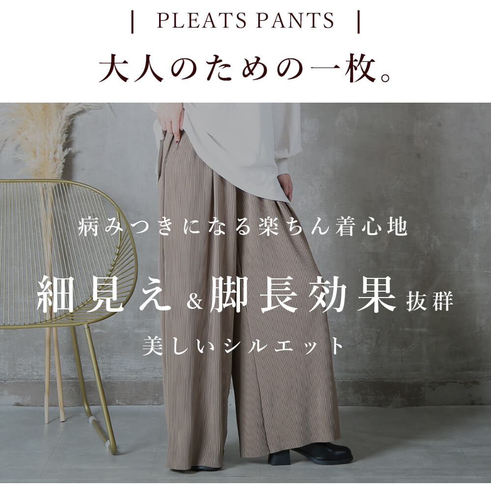 計算されたシルエットで足長効果も抜群のプリーツパンツ。ゆったりとした着心地で体型カバーもでき、ストレスフリーに美シルエットを演出。洗濯してもプリーツが崩れにくく、日常使いに最適な一本です。
