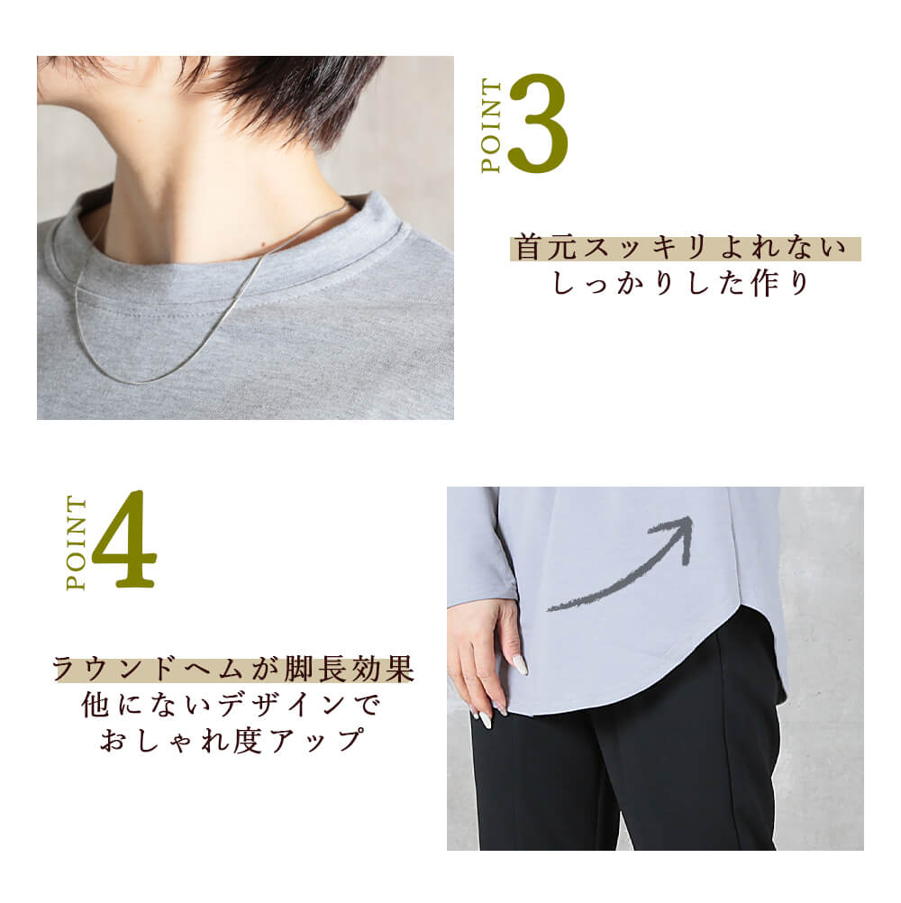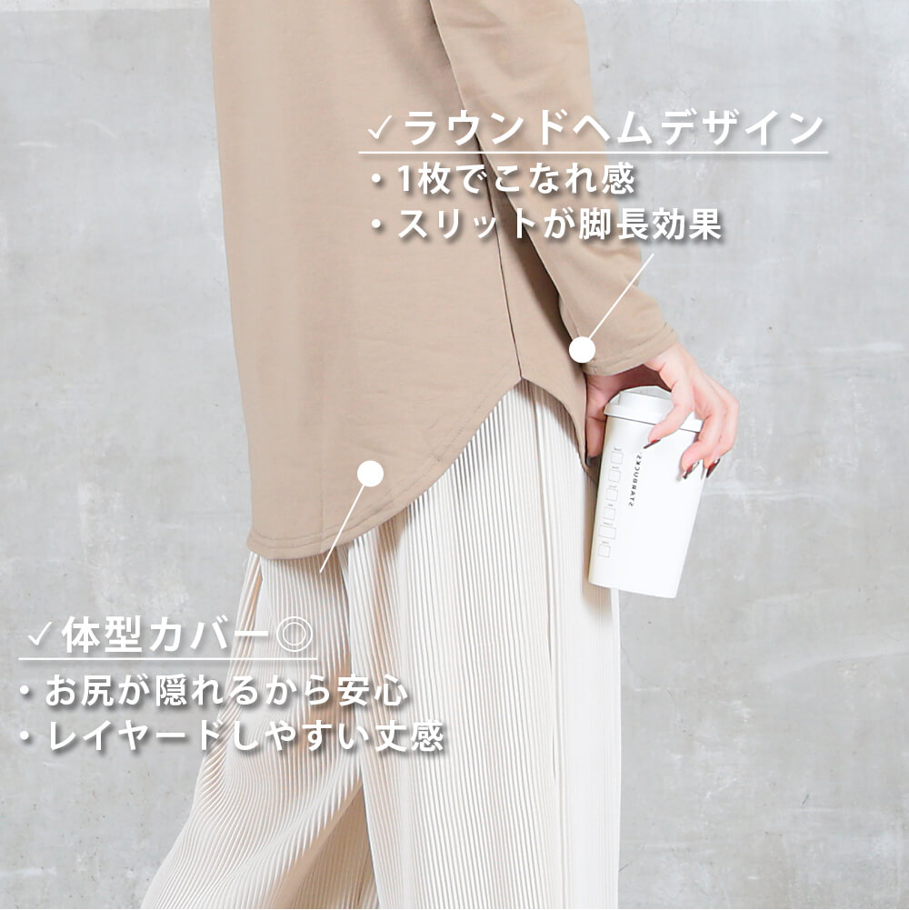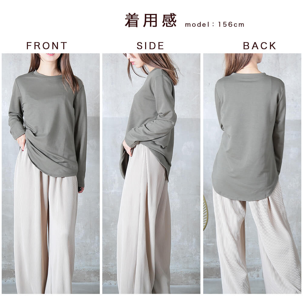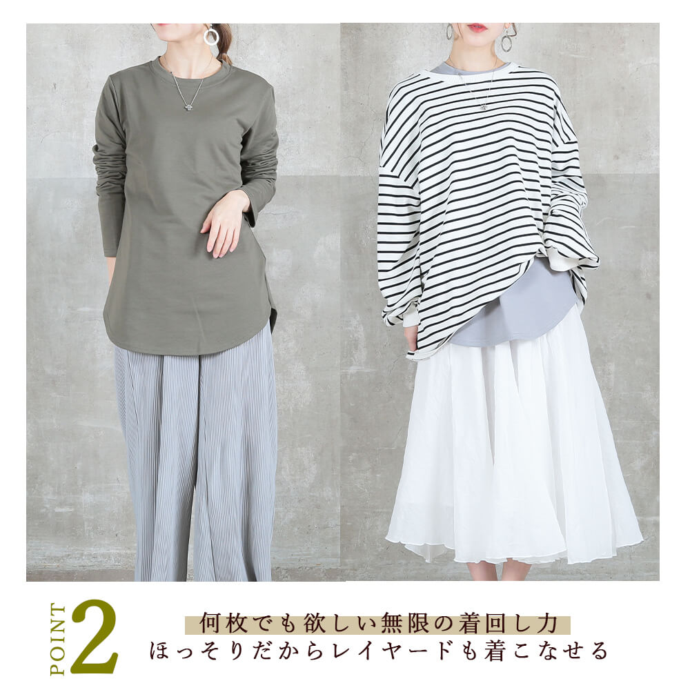一枚で理想のカジュアルスタイルが決まる長袖カットソー。ゆったり感がありながらも着ぶくれせず、体のラインを自然にカバー。計算されたラウンドヘムで、1枚でも重ね着でもおしゃれ見えを実現。しわになりにくく、毎日着たくなる快適さが魅力です。
