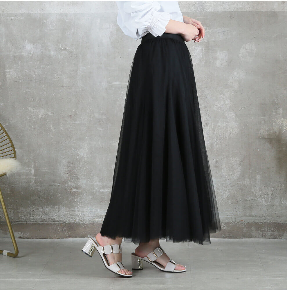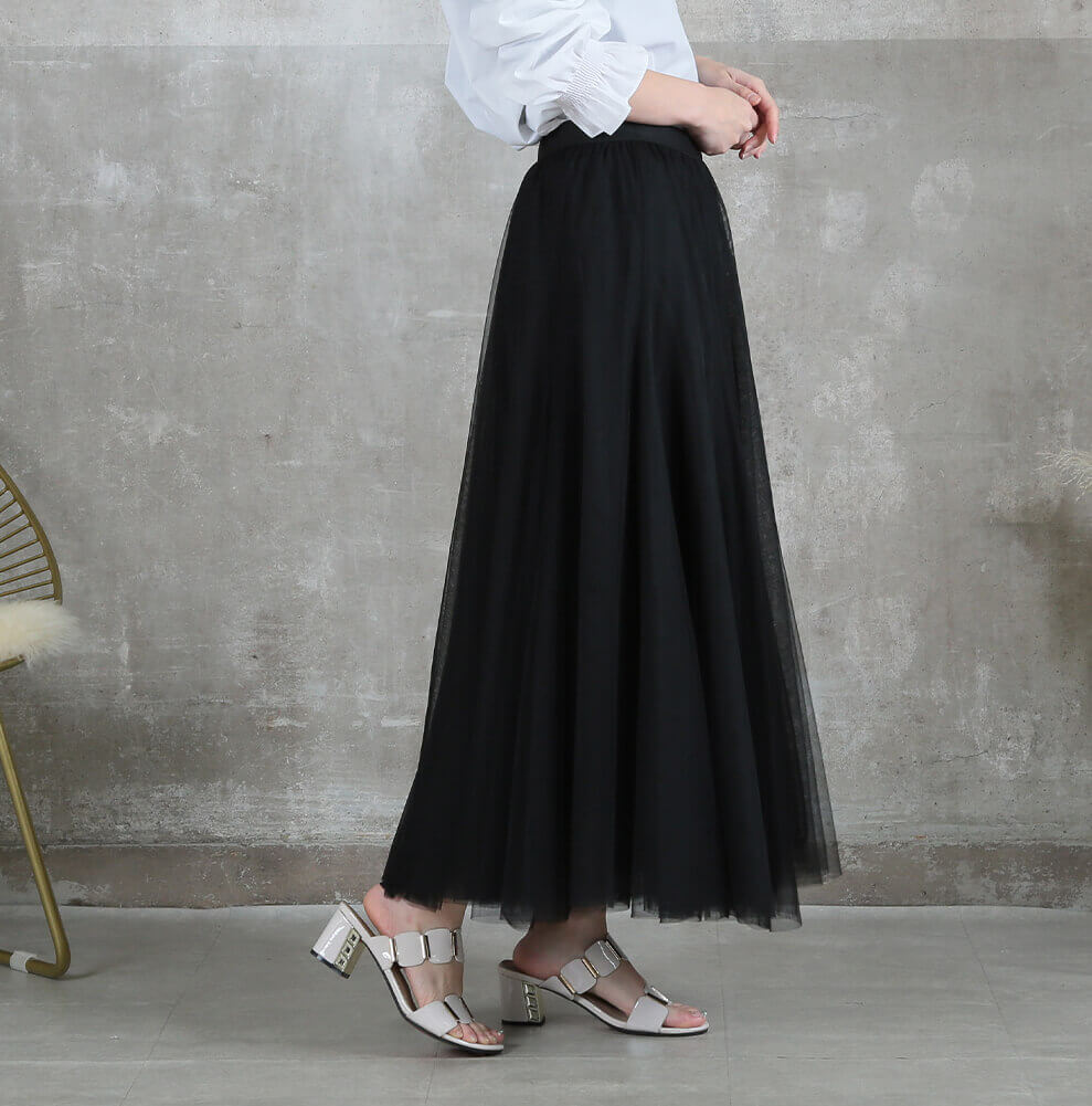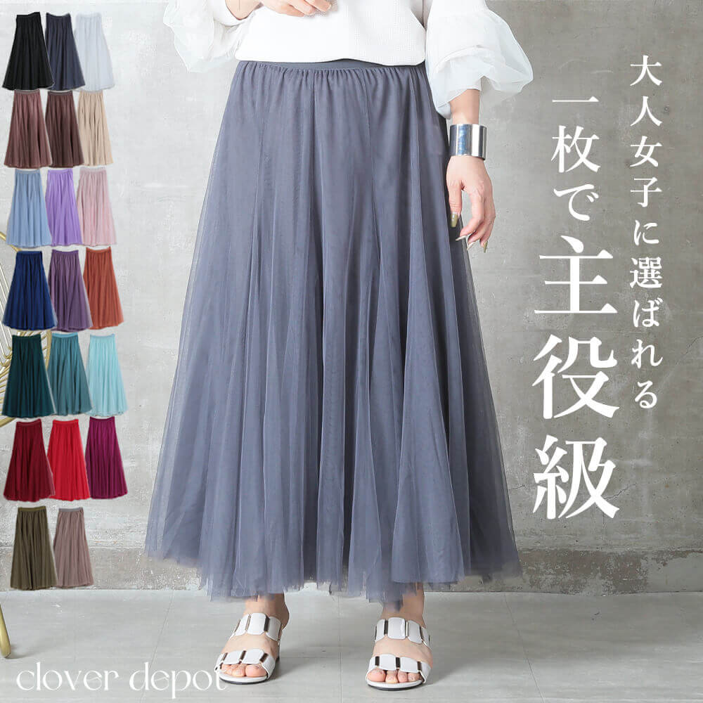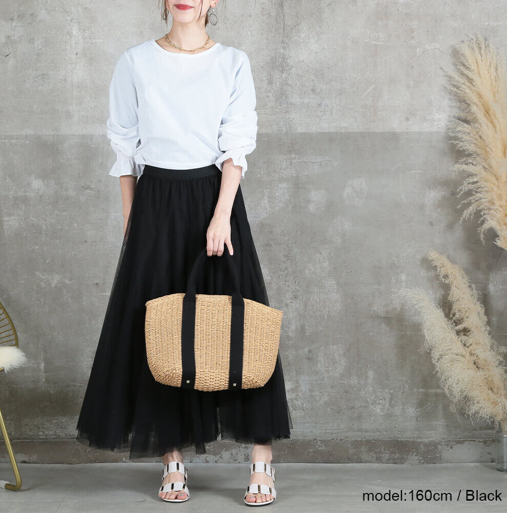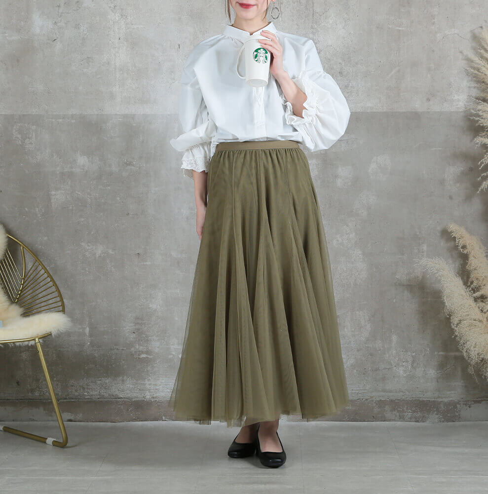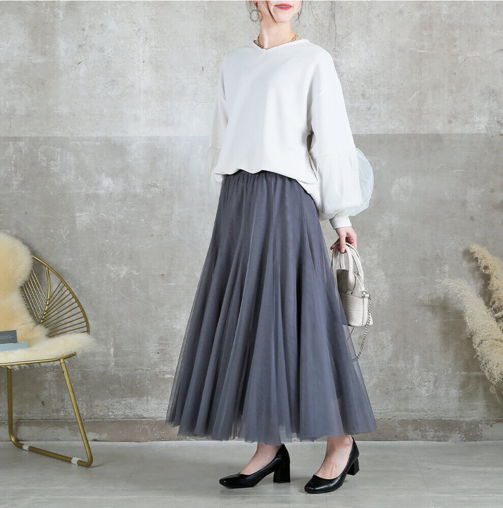 涼しげに揺れるチュールが、大人の着こなしに華やぎをプラス。