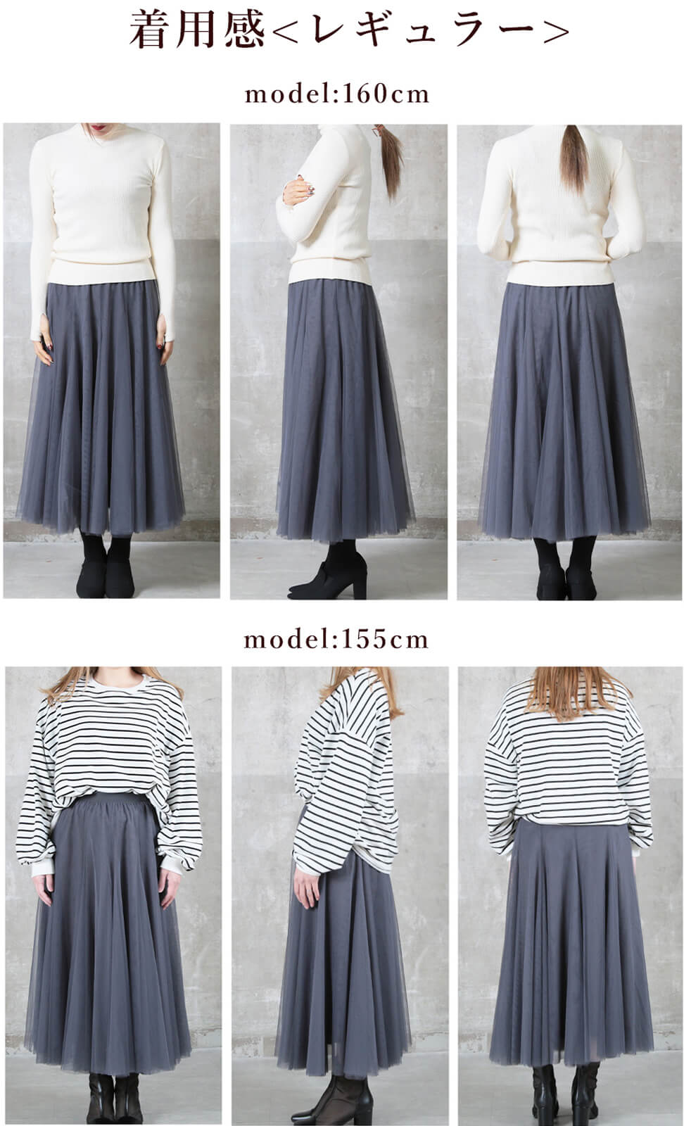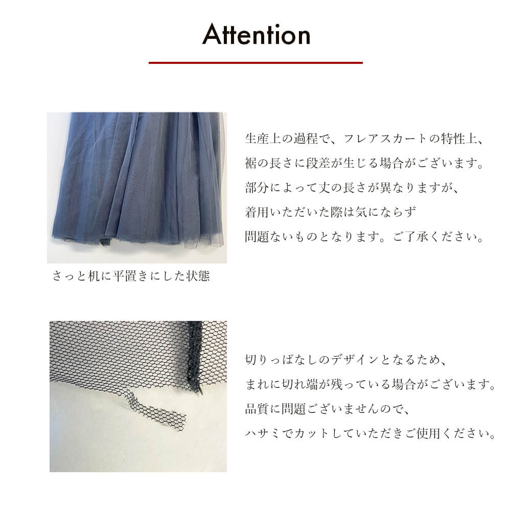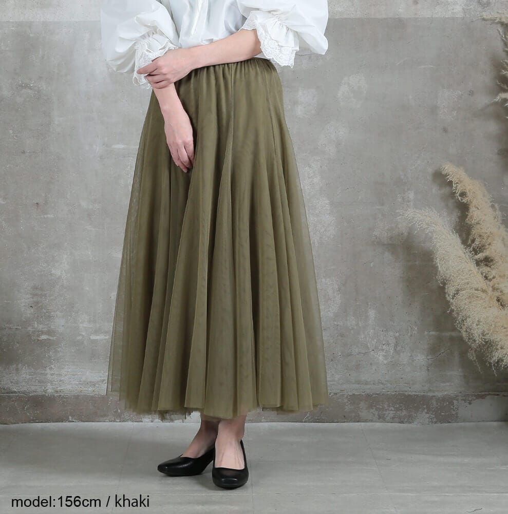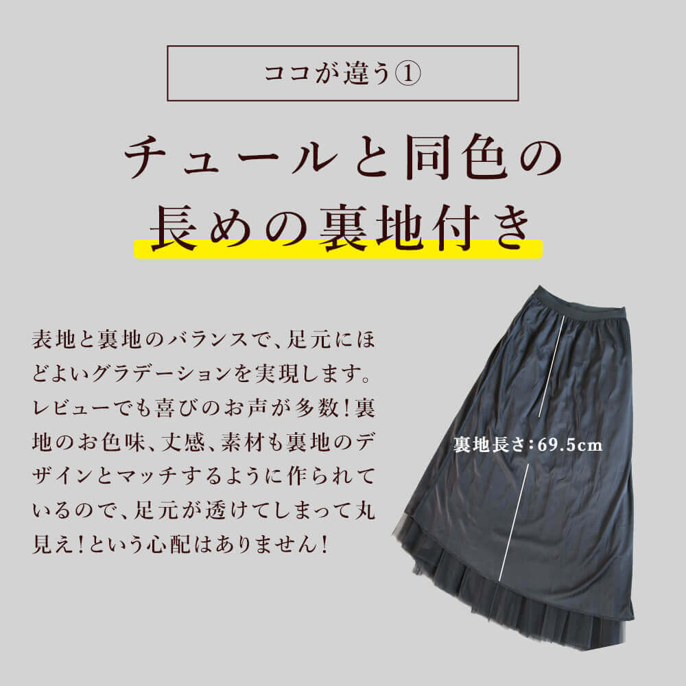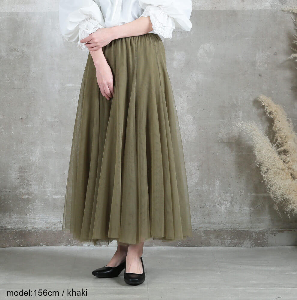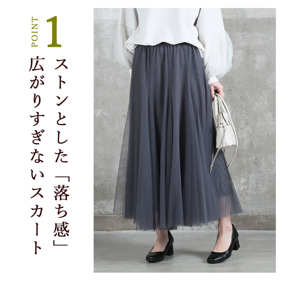 透け感のあるチュールが縦ラインを引き立て、すっきり細見え。