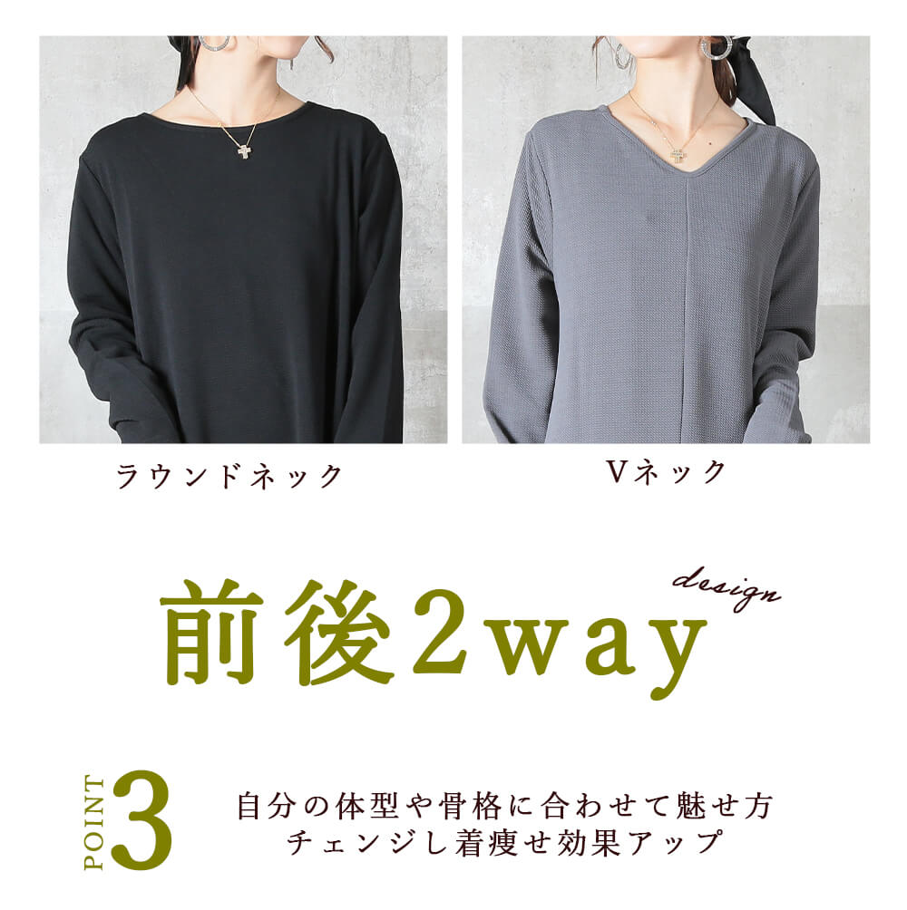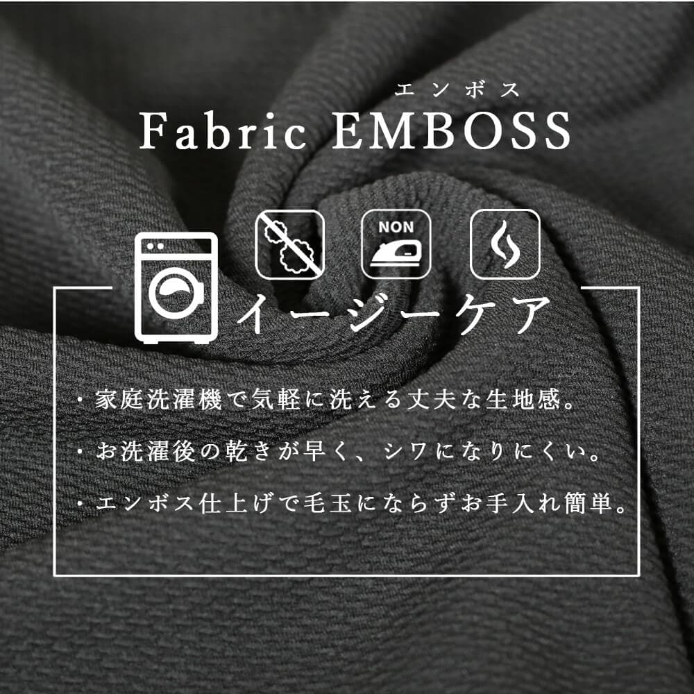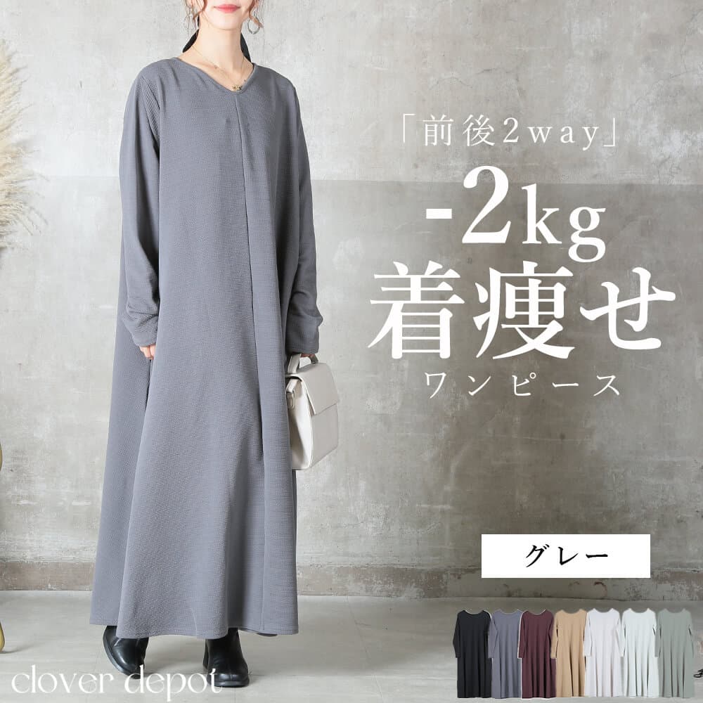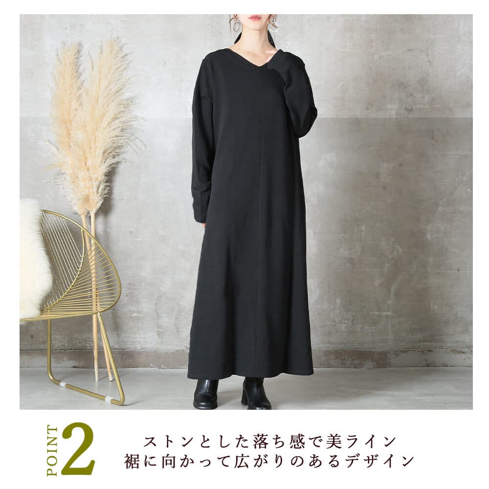 前後の着用スタイルを選べる2way仕様のマキシ丈ワンピースで、こなれ感がありながら1枚でスタイリングが完成。エンボス加工された表面がほどよい立体感を与え、シワになりにくくお手入れが簡単。上質な雰囲気がありつつ、普段着としても気軽に使えるデザイン。