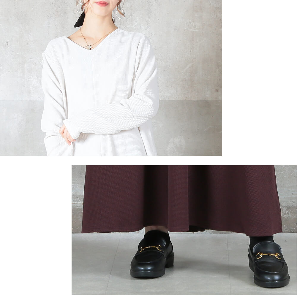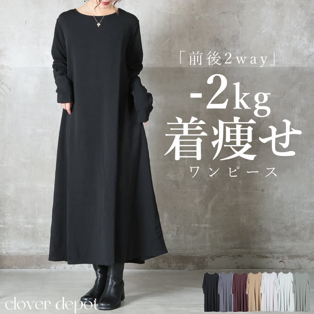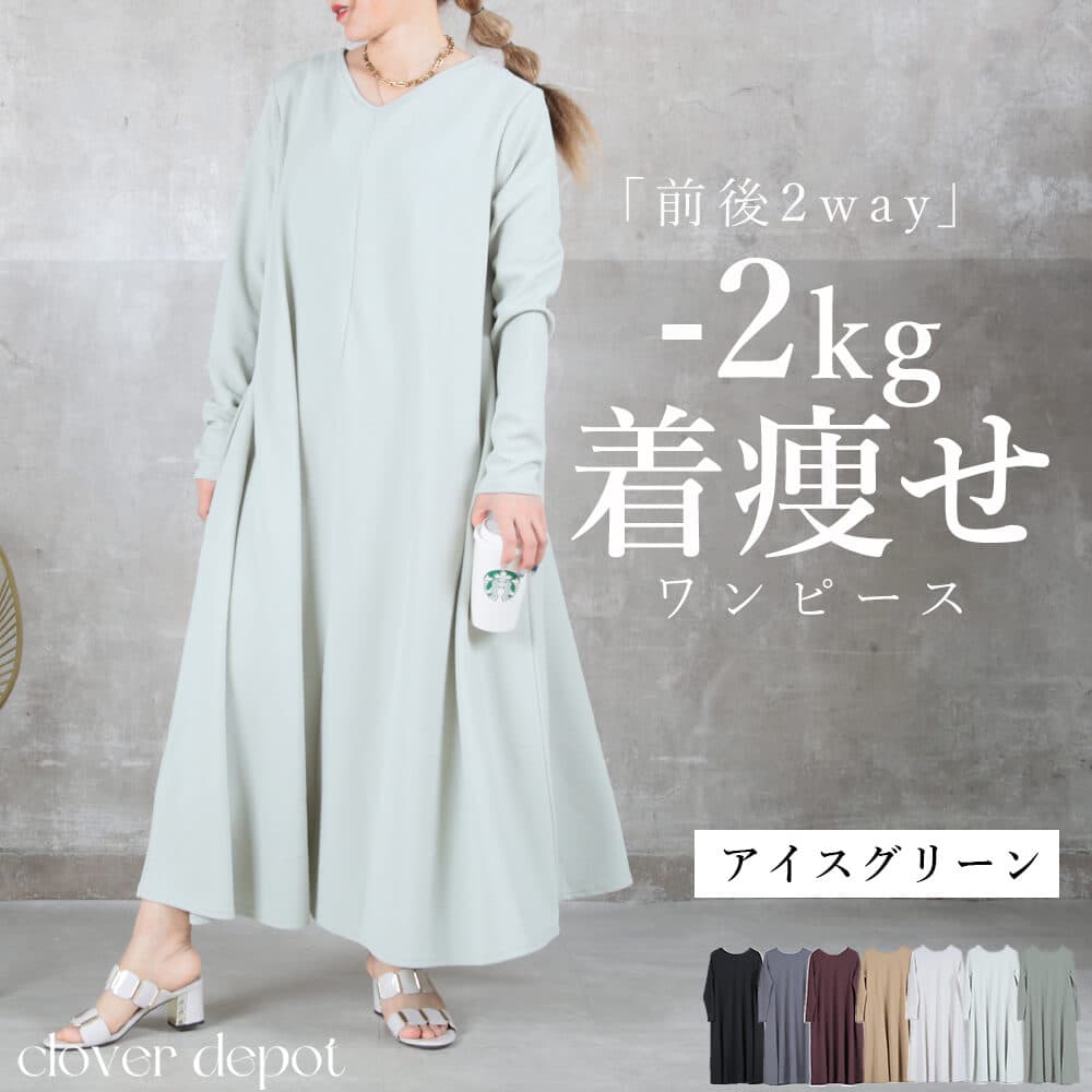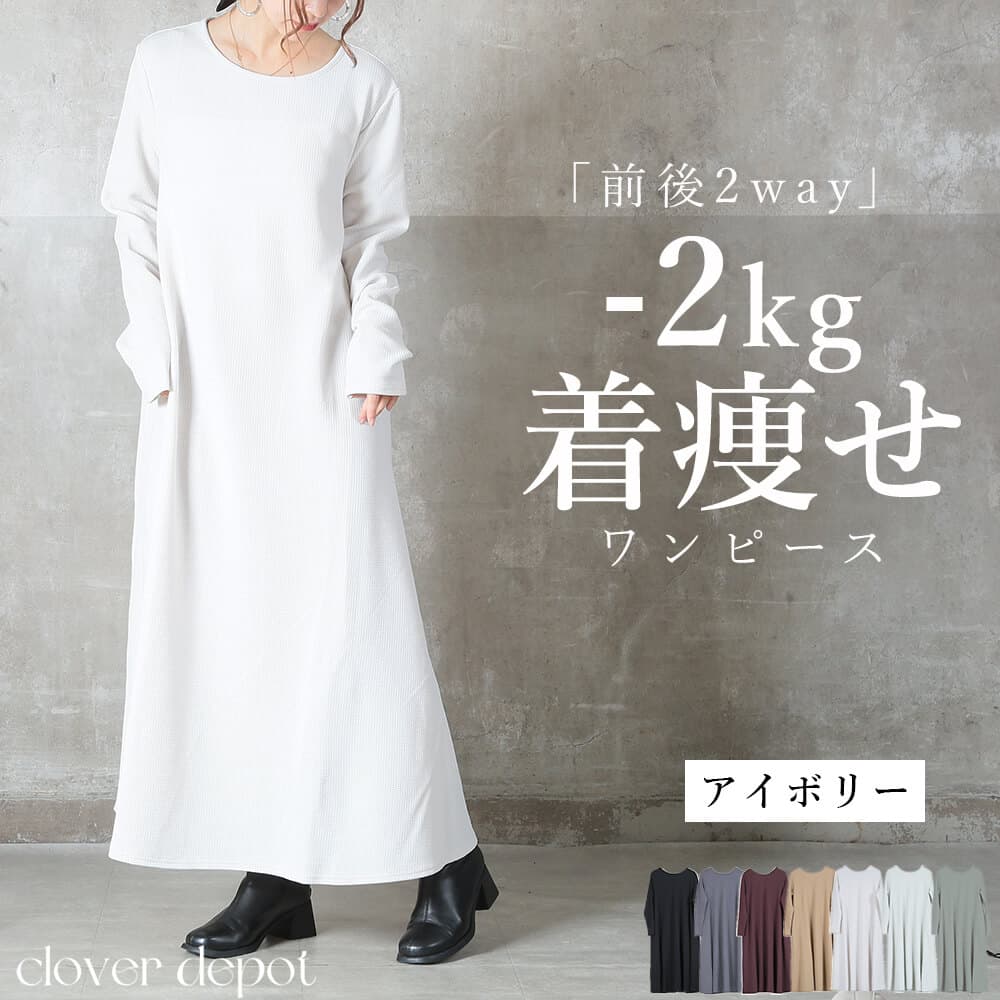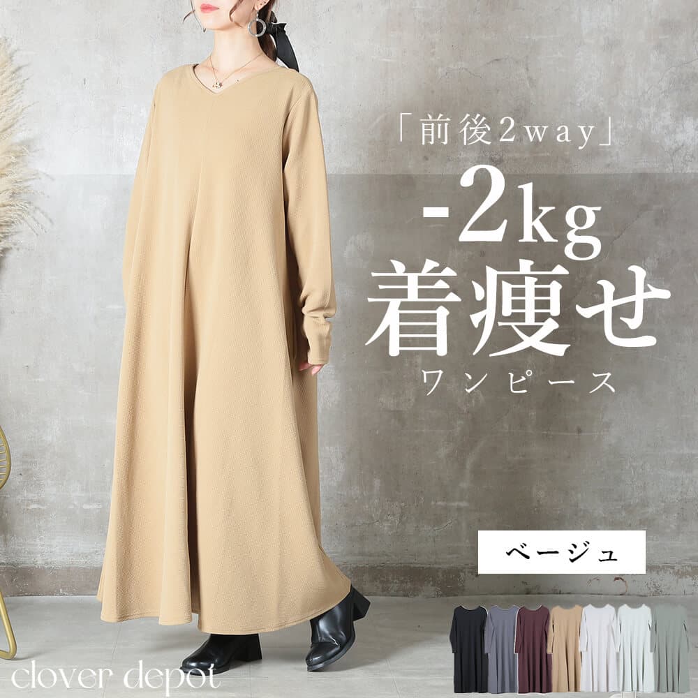 前後の着用スタイルを選べる2way仕様のマキシ丈ワンピースで、こなれ感がありながら1枚でスタイリングが完成。エンボス加工された表面がほどよい立体感を与え、シワになりにくくお手入れが簡単。上質な雰囲気がありつつ、普段着としても気軽に使えるデザイン。