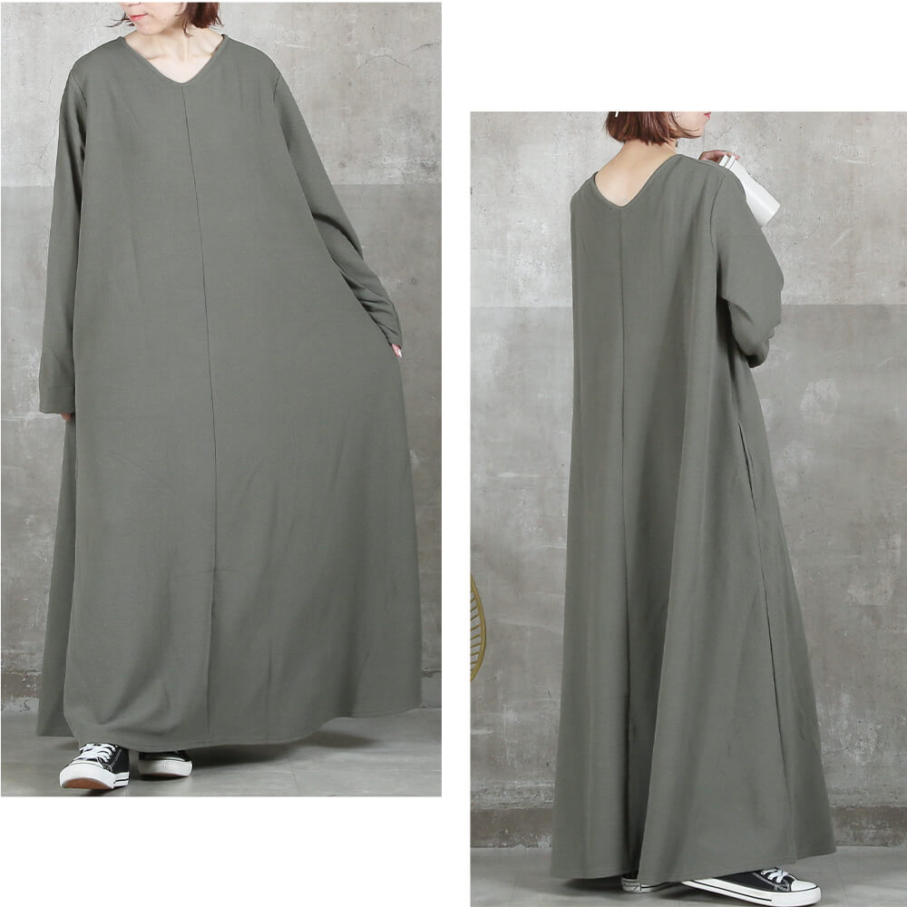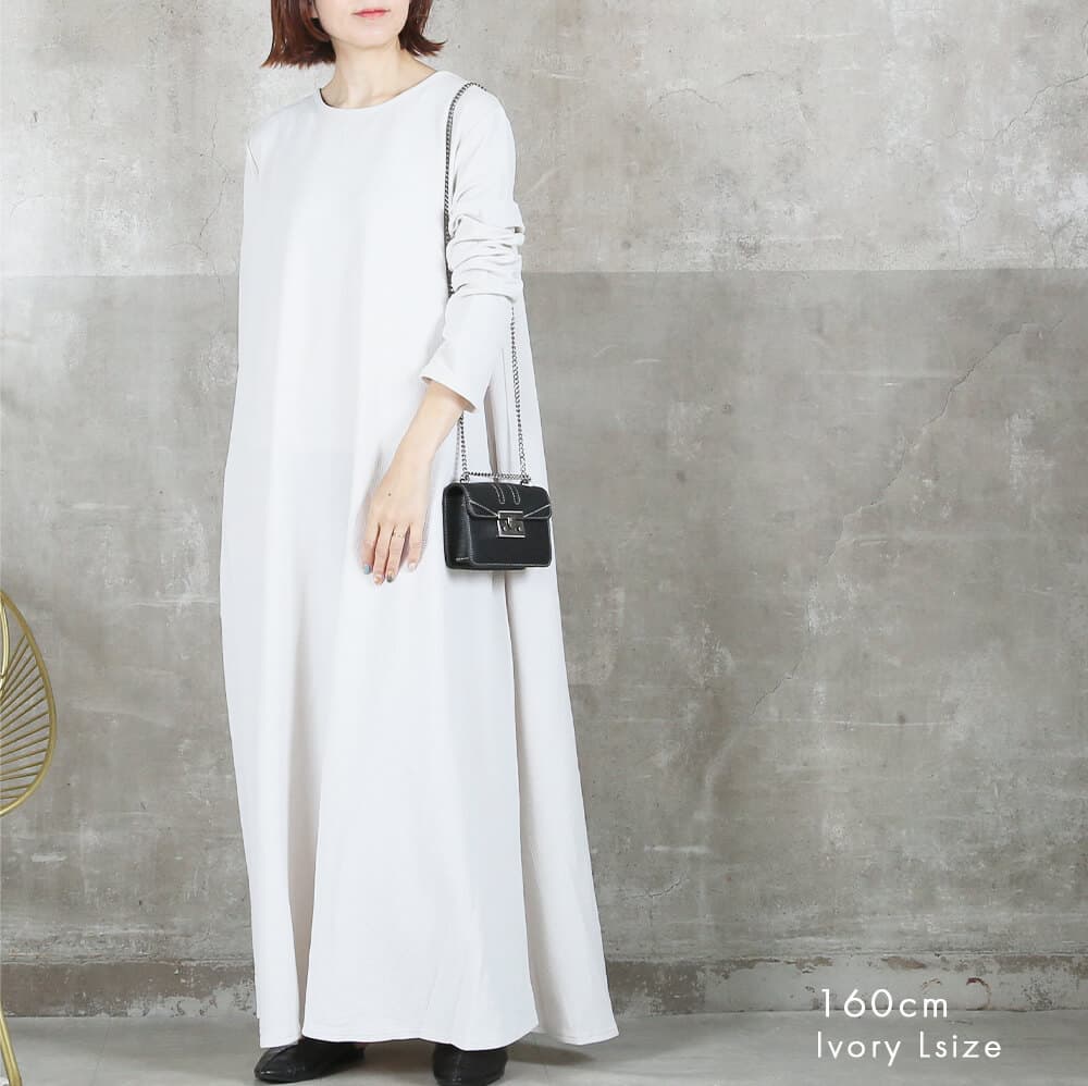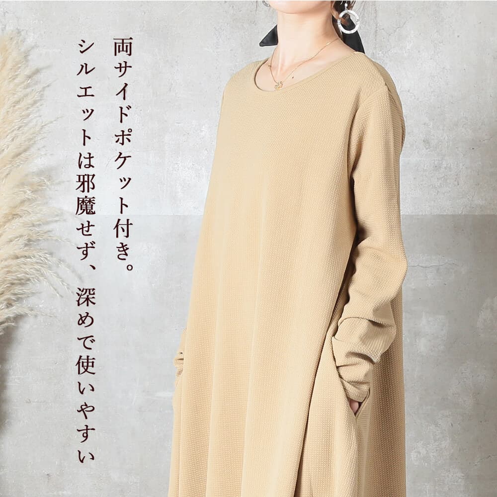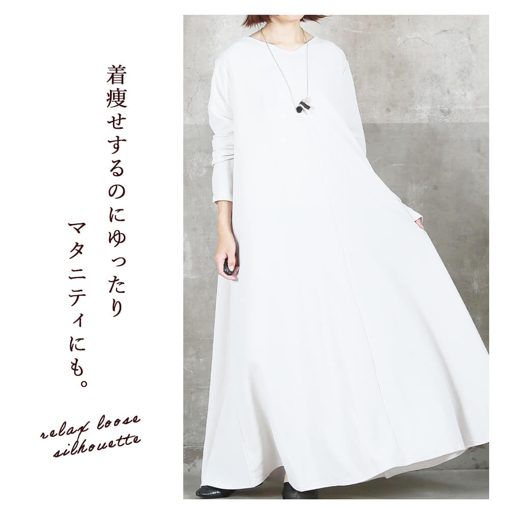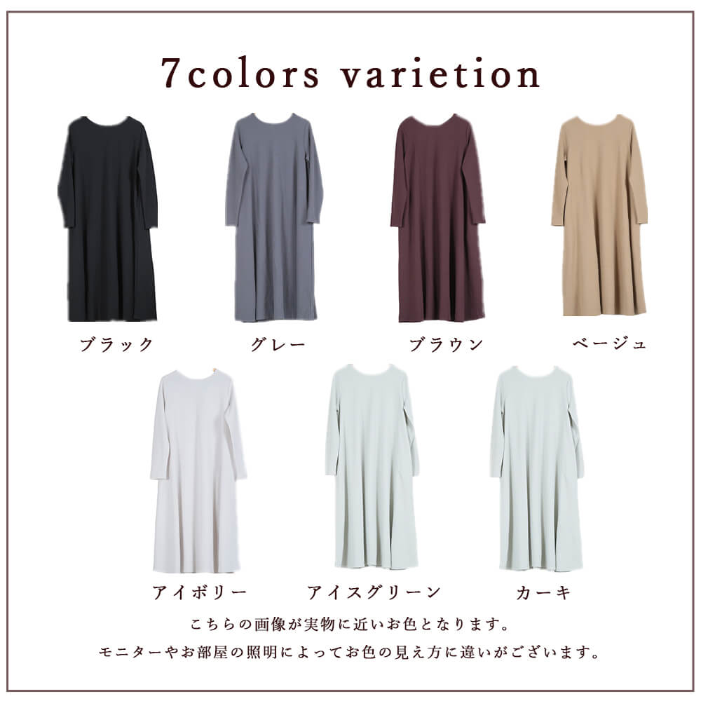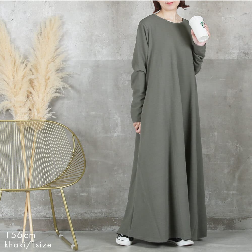 毎日着たくなる快適さ長袖&マキシ丈設計で、寒暖差のある季節にも心地よく対応。素材はポリエステル・スパンデックス混で伸縮性があり、動きやすさをキープ。洗濯機で洗えておうちケアもラクだから、忙しい30〜40代女性にぴったり。淡色はやや透けるのでインナー選びだけ注意すれば◎。