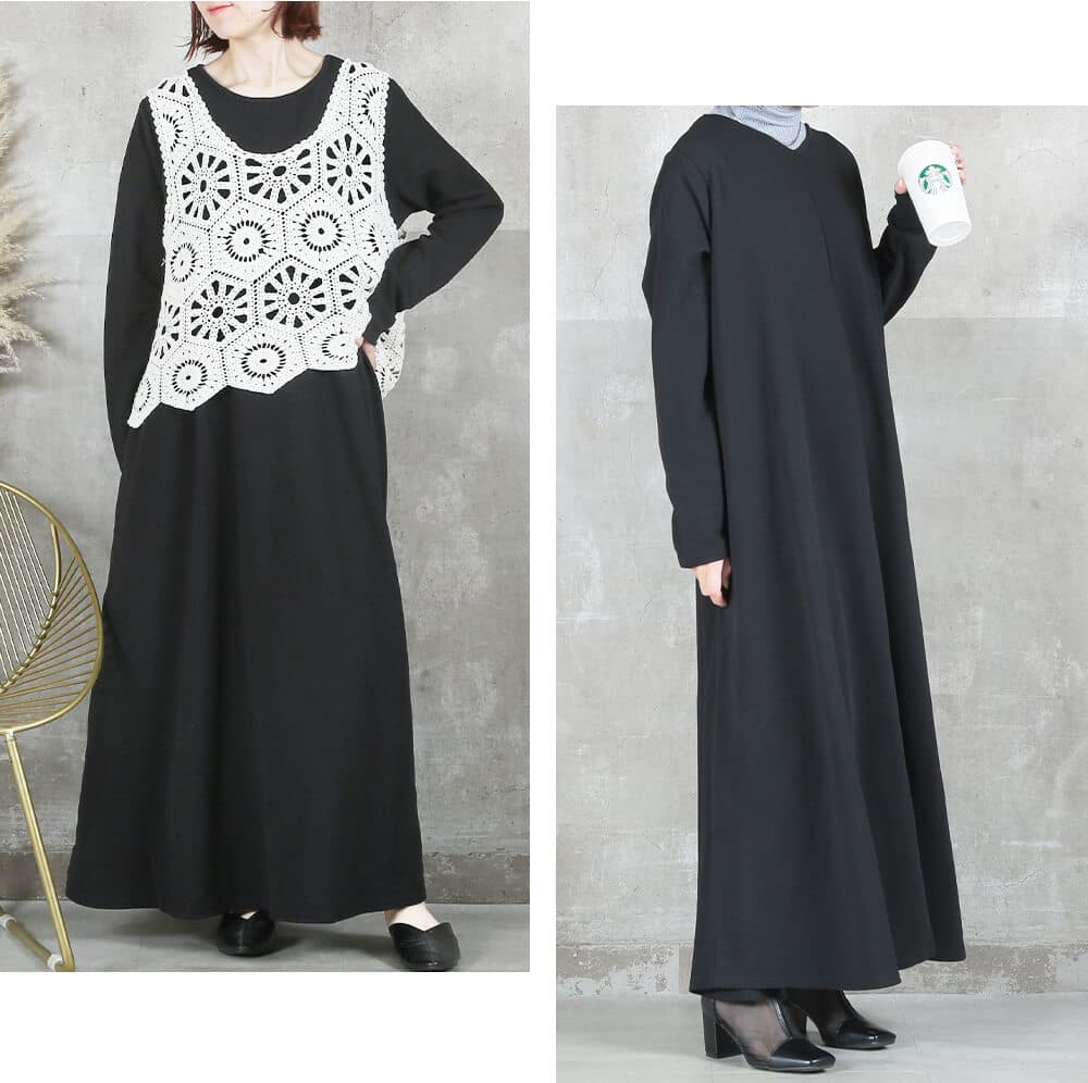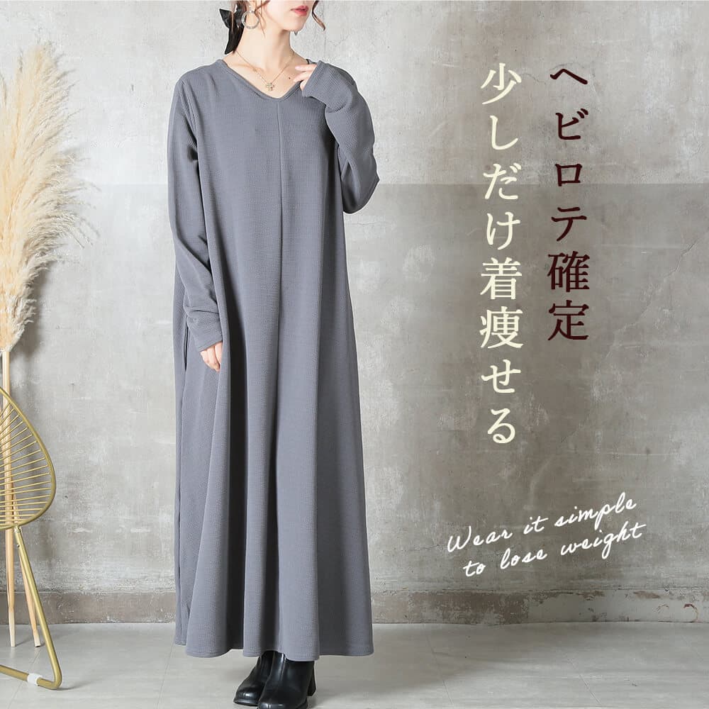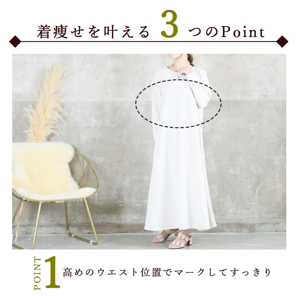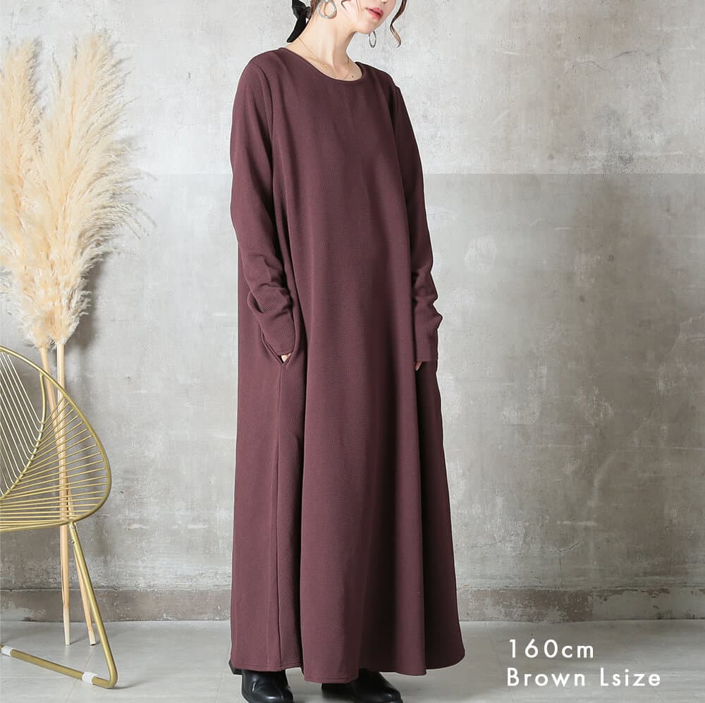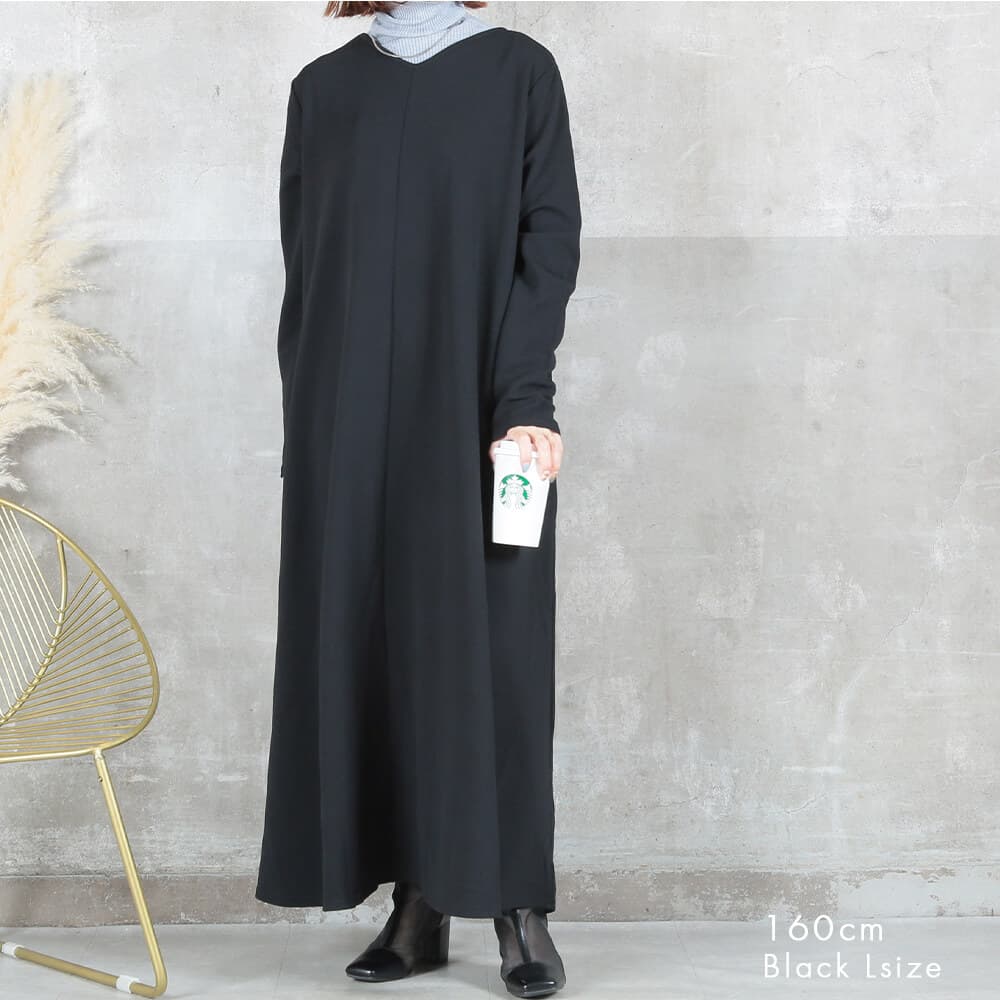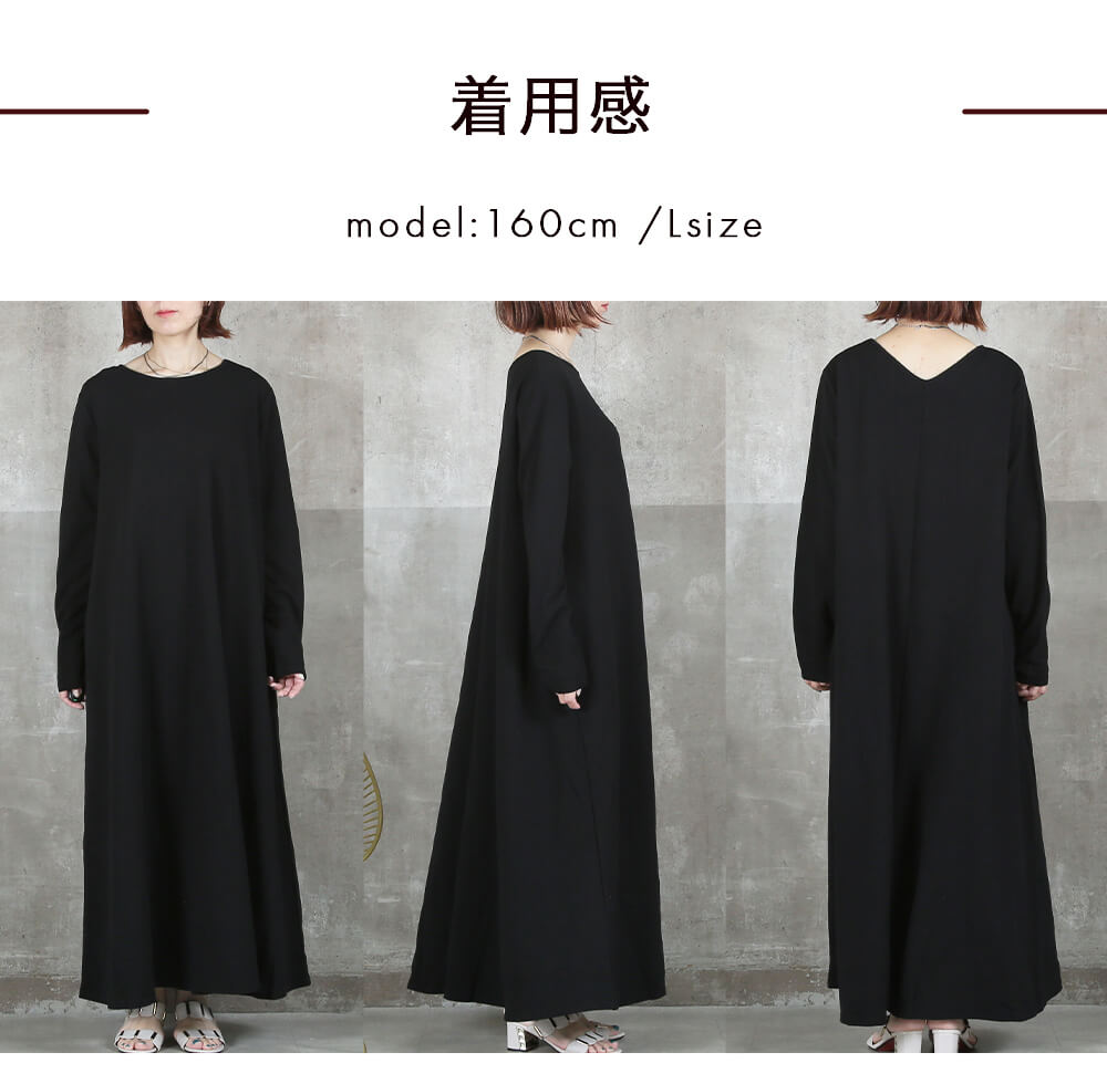 毎日着たくなる快適さ長袖&マキシ丈設計で、寒暖差のある季節にも心地よく対応。素材はポリエステル・スパンデックス混で伸縮性があり、動きやすさをキープ。洗濯機で洗えておうちケアもラクだから、忙しい30〜40代女性にぴったり。淡色はやや透けるのでインナー選びだけ注意すれば◎。