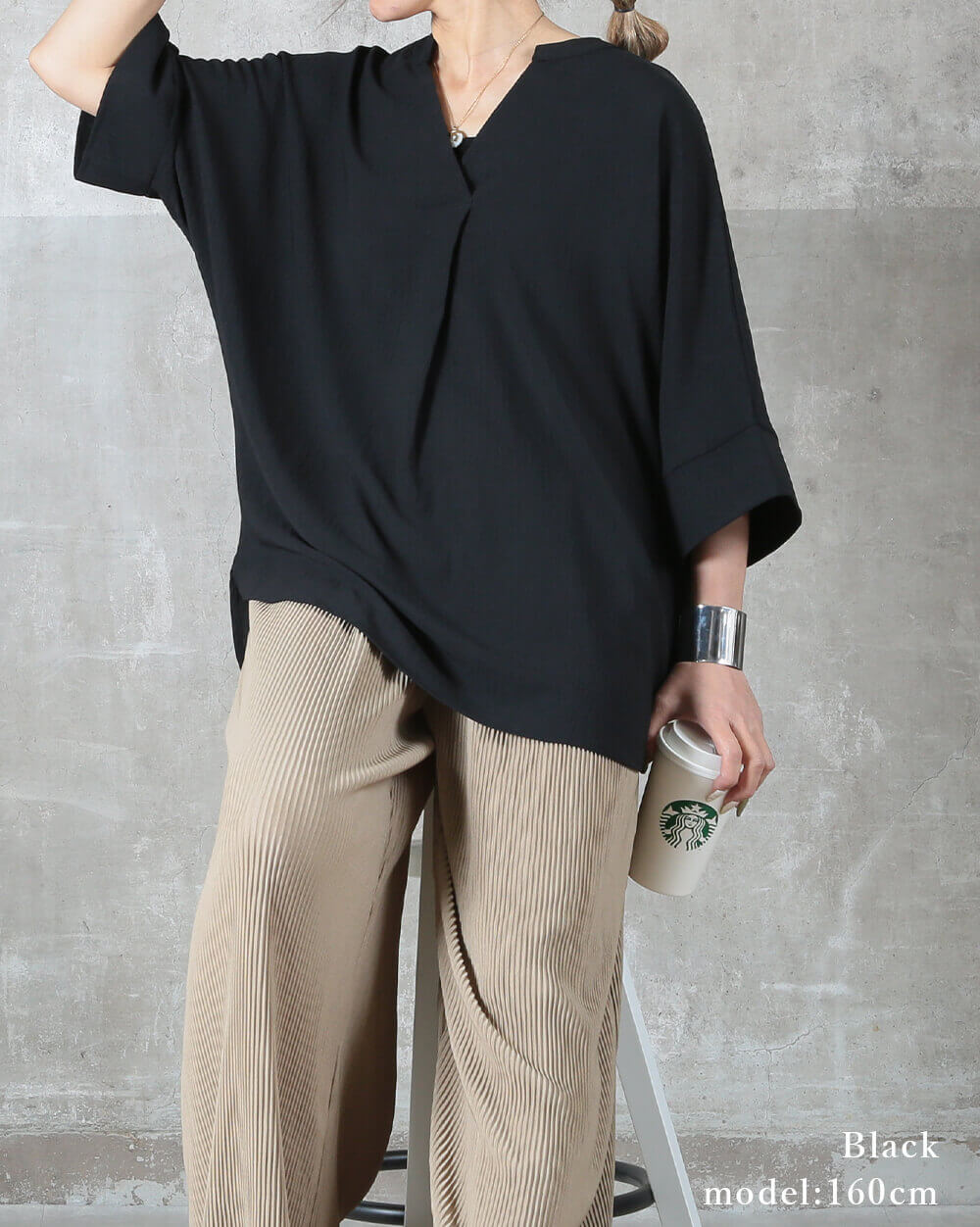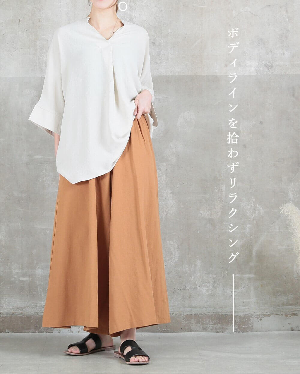 毎日着たくなる快適さ袖口ゆったりで風通し良く、長めの着丈が腰回りやお尻までしっかりカバー。肌にまとわりつかず、ゆるっと楽な着心地で一日中快適に過ごせます。シンプルデザインでコーデも簡単!