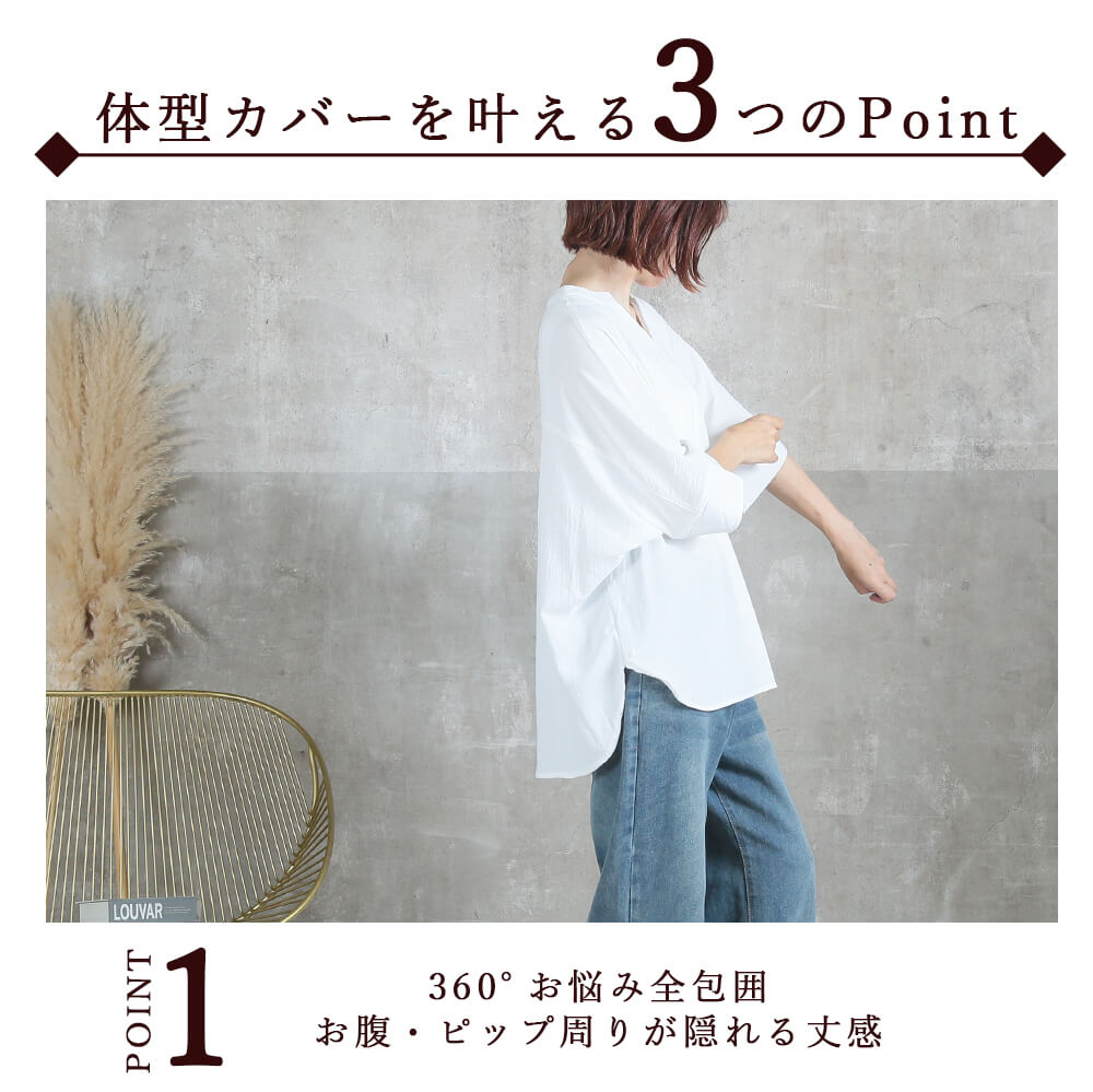 体型カバーもおしゃれも欲張りたい女性へ。自慢のドルマンシャツは、360度どこから見ても美シルエット。ゆったり着られて、長め丈が腰やお尻をしっかりカバー。パンツ・スカートどちらにも合わせやすい万能トップス!春夏秋まで使えて着回し力も抜群。
