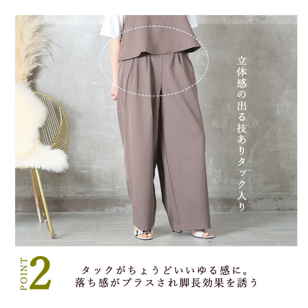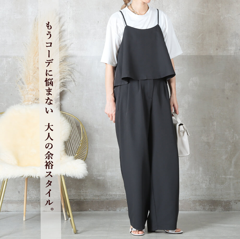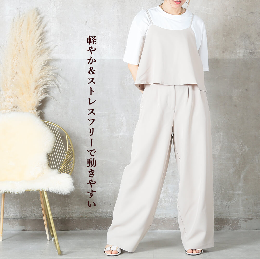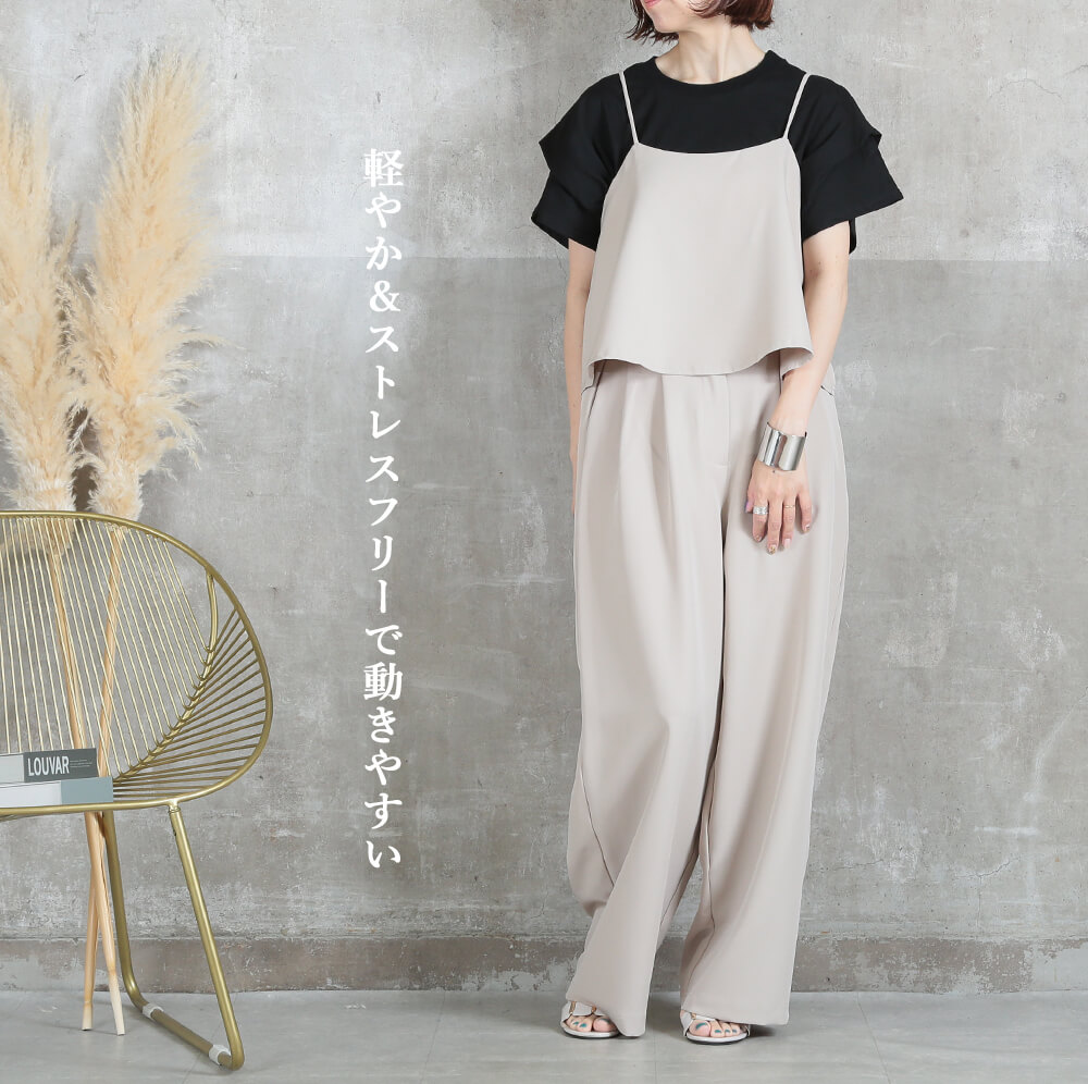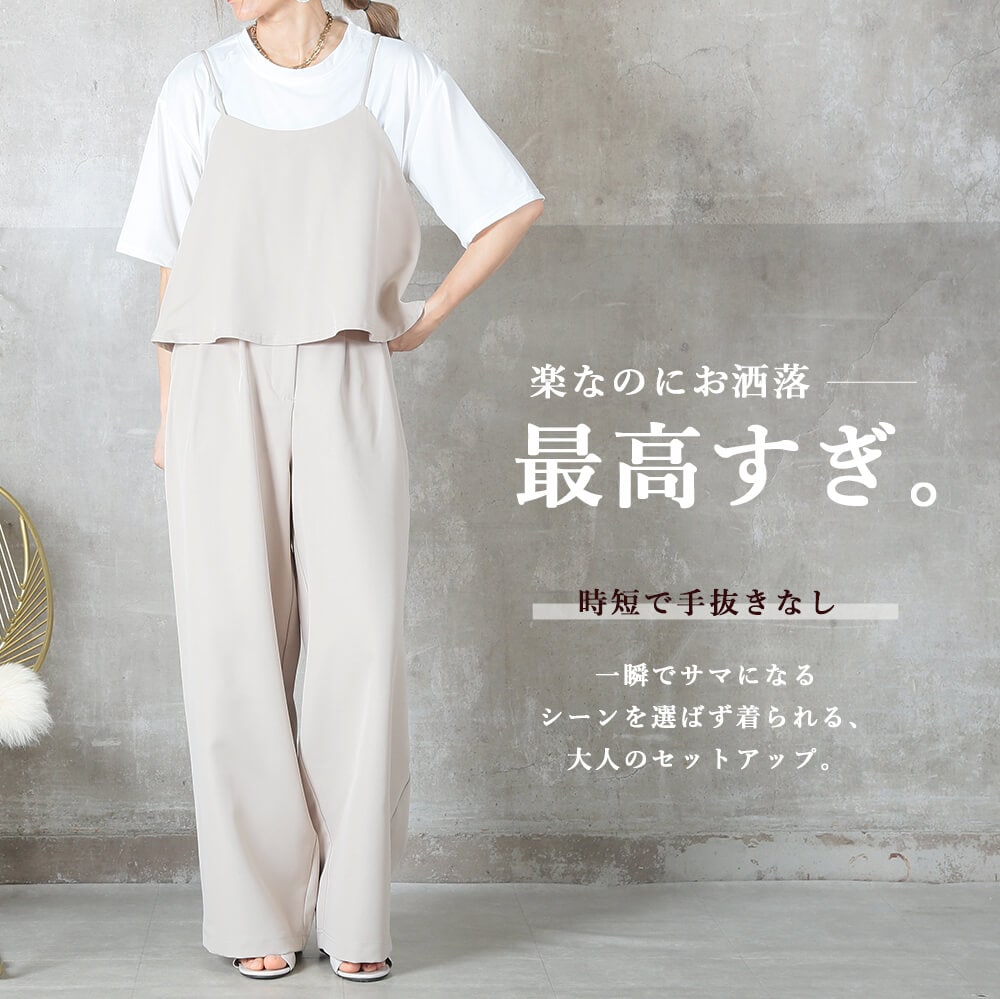 おしゃれに見えて、実は着心地ラクラク。キャミトップスとワイドパンツの2点セットで、忙しい朝もコーデが完成。きれいめもカジュアルも幅広く使え、シーズン問わず長く着られるアイテムです。