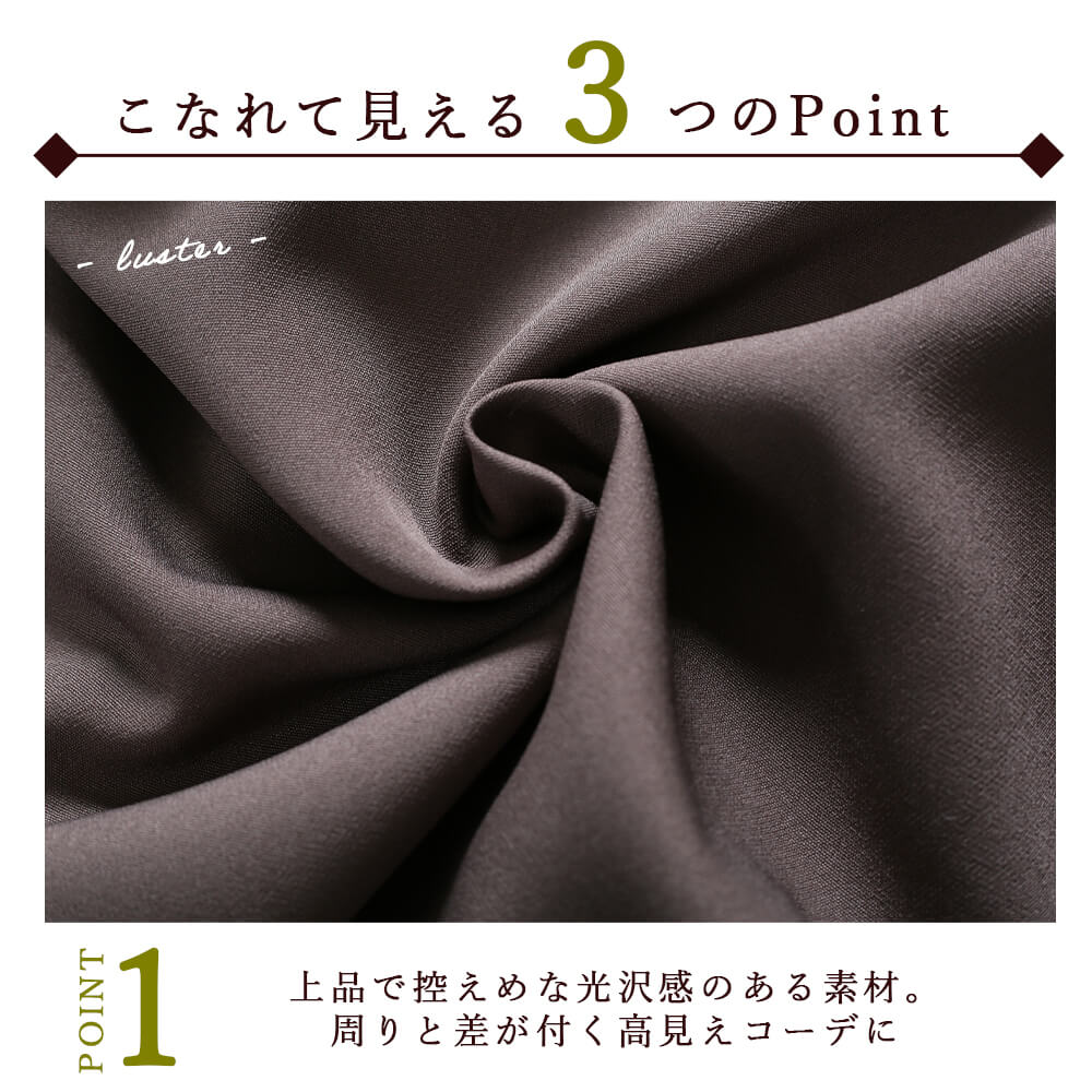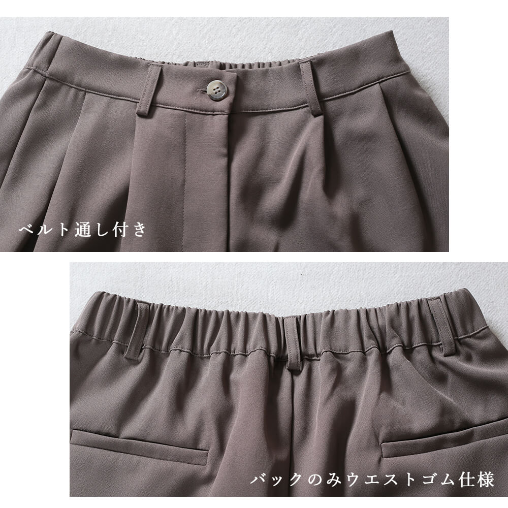 毎日着たくなる快適さ楽ちんポリエステル素材で肌あたりさらっと。ウエストやヒップ周りが気になる人も安心のゆとり設計。シワになりにくく、ご自宅でのお手入れも簡単。朝の時短コーデや、旅行・おうち時間にもピッタリ。