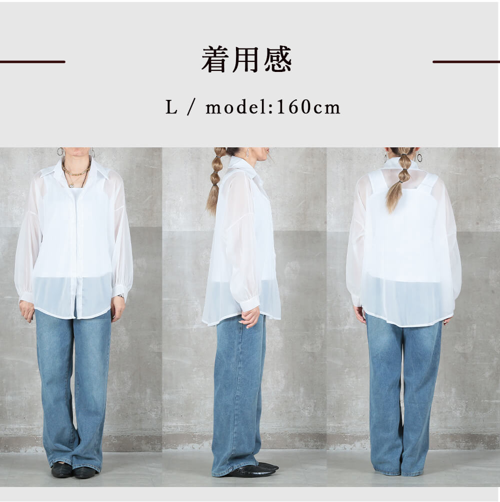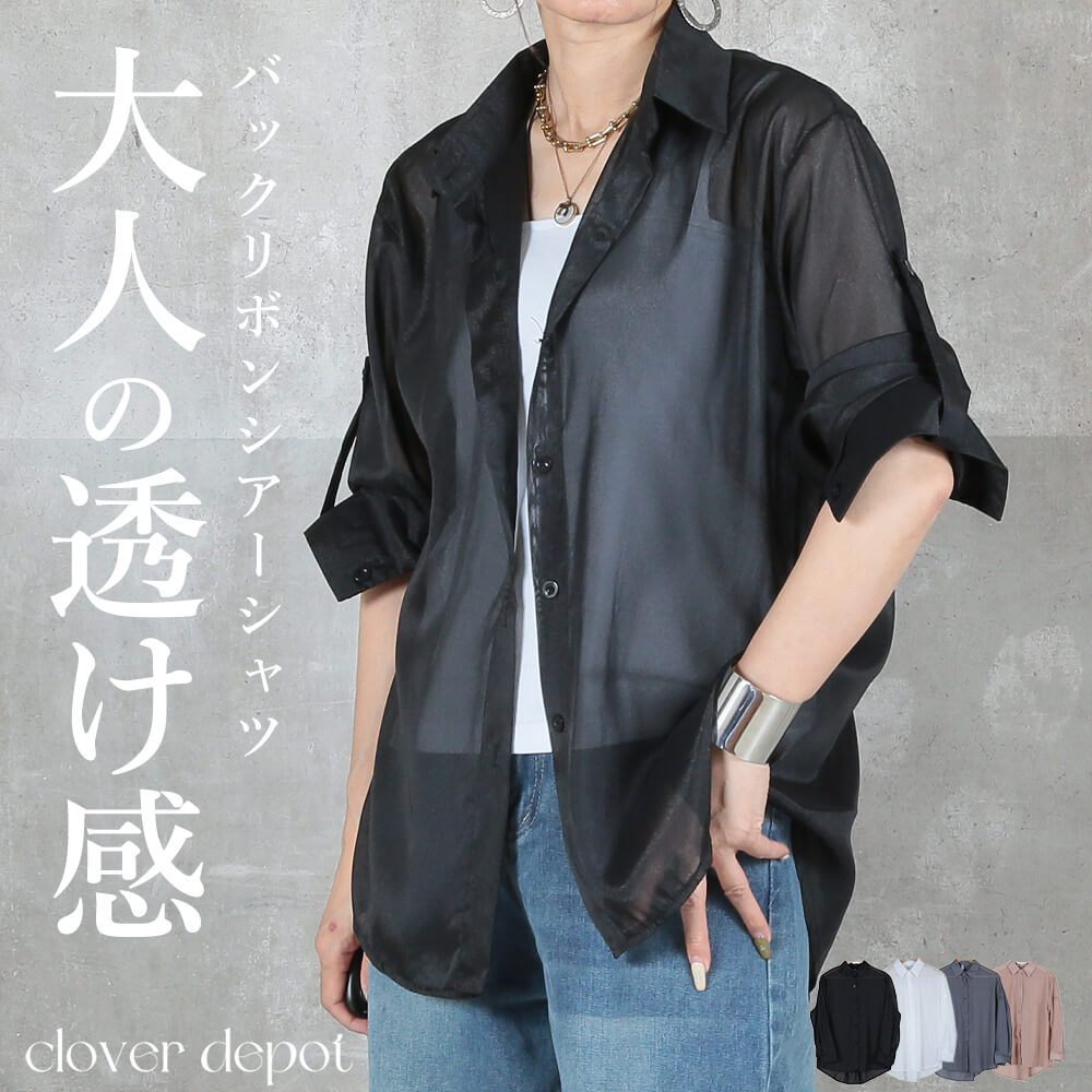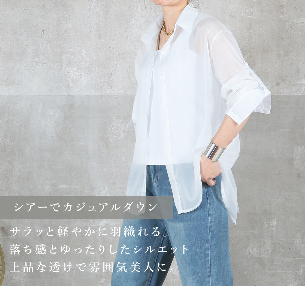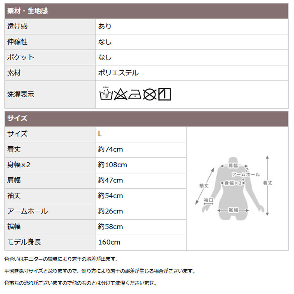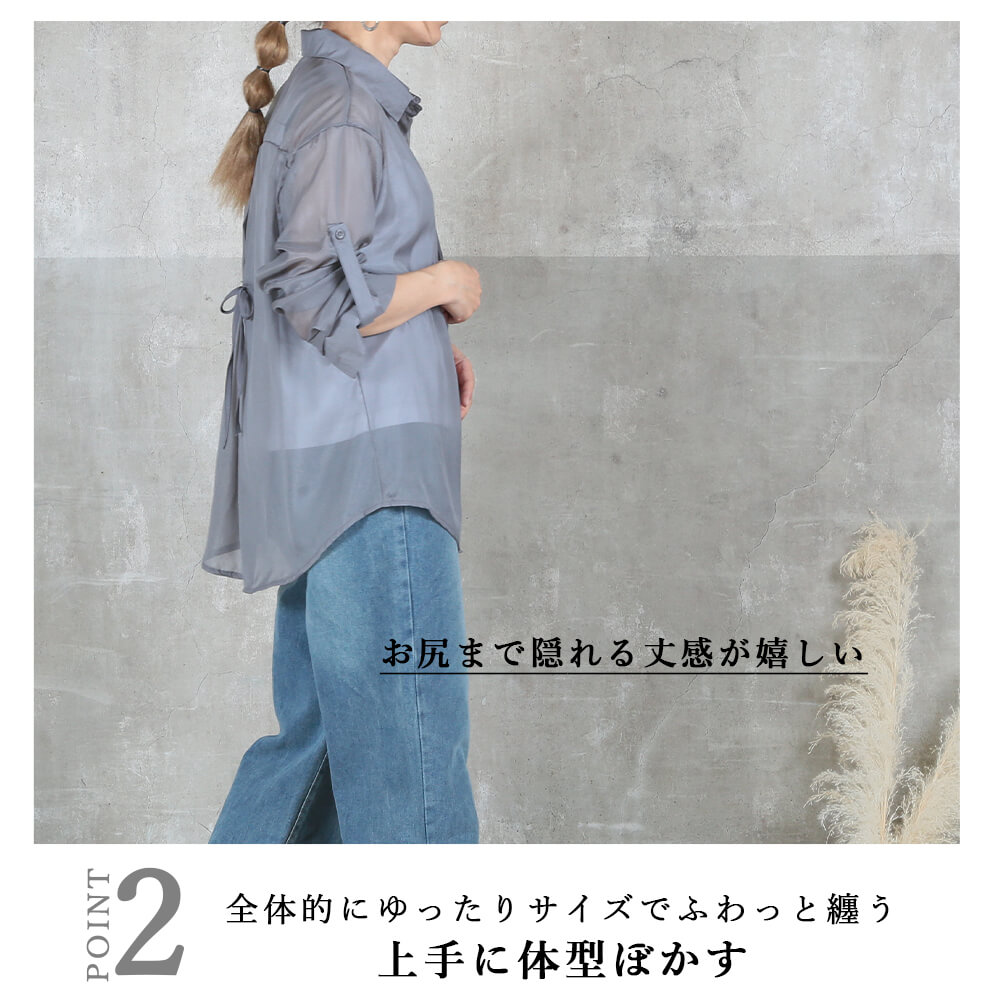 透け感のある軽やかなポリエステル素材で、羽織るだけで女性らしい抜け感スタイルに。背中部分のリボンでシルエットを調整でき、後ろ姿まで印象的に。長めの着丈とゆったり身幅で、体型カバーもしつつ軽やかにまとえる一枚です。