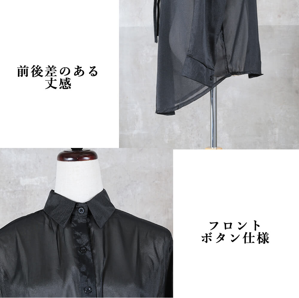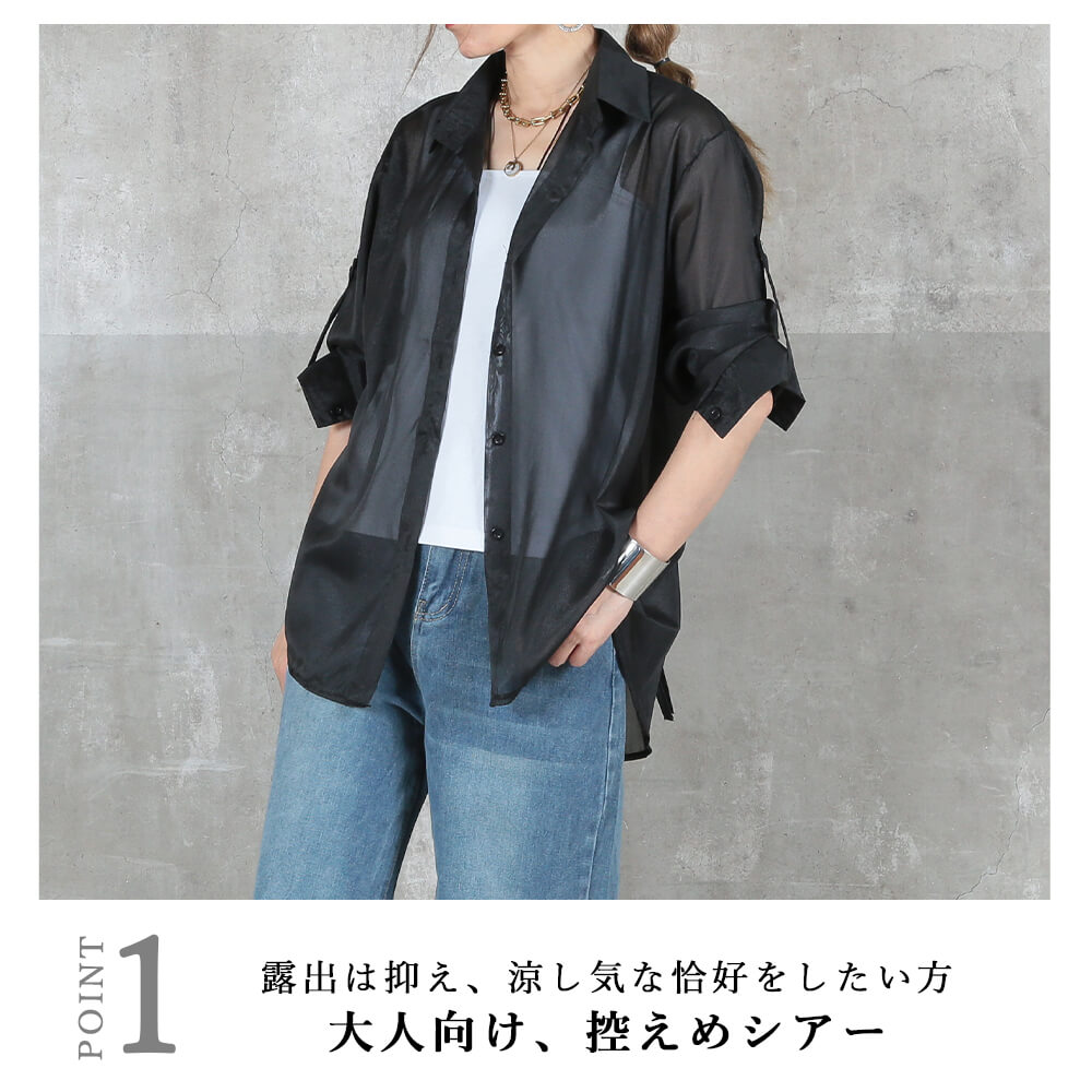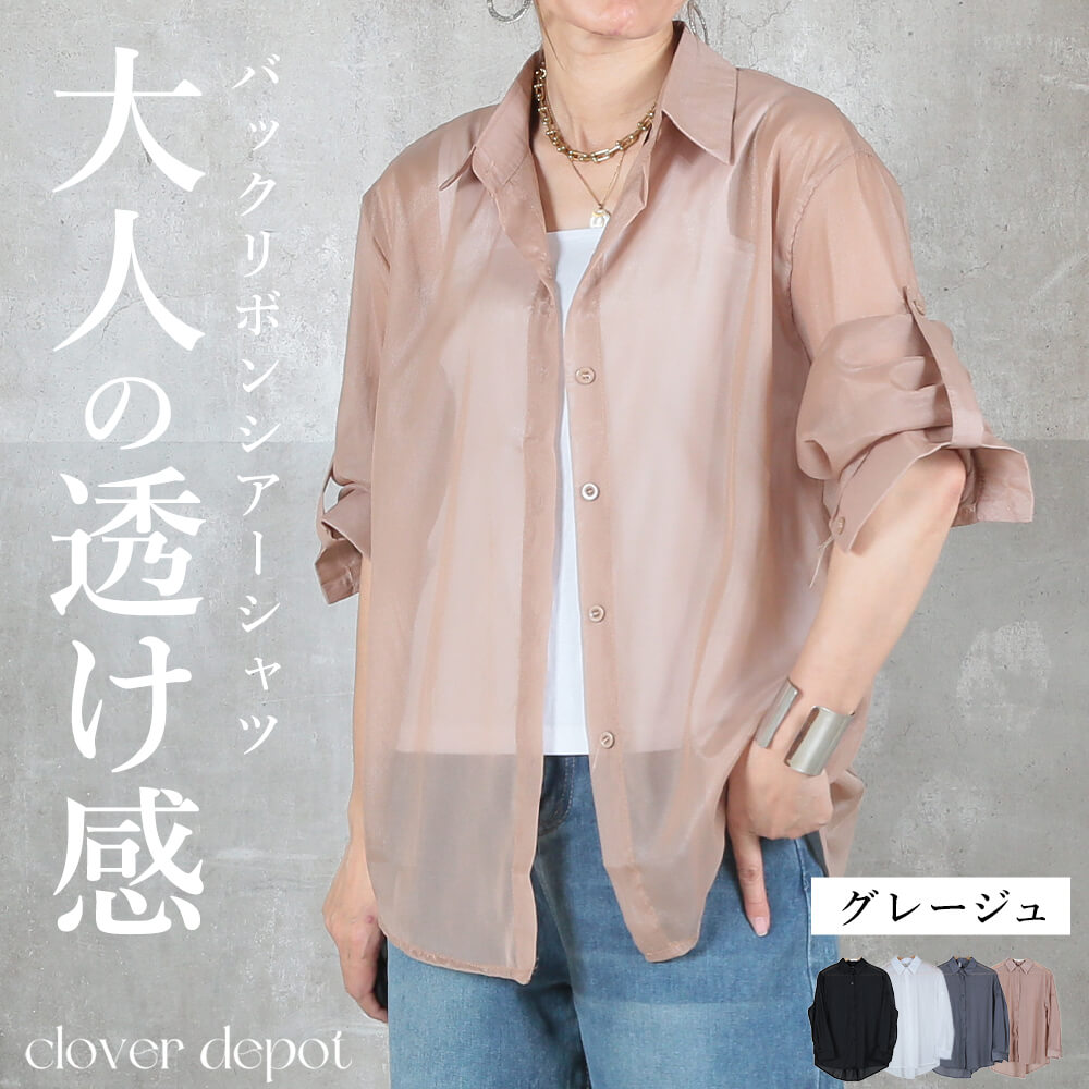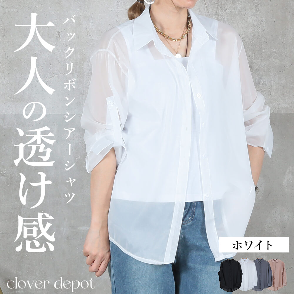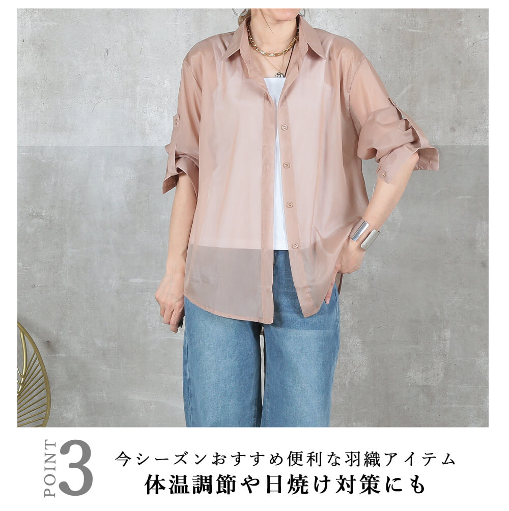 透け感のある軽やかなポリエステル素材で、羽織るだけで女性らしい抜け感スタイルに。背中部分のリボンでシルエットを調整でき、後ろ姿まで印象的に。長めの着丈とゆったり身幅で、体型カバーもしつつ軽やかにまとえる一枚です。