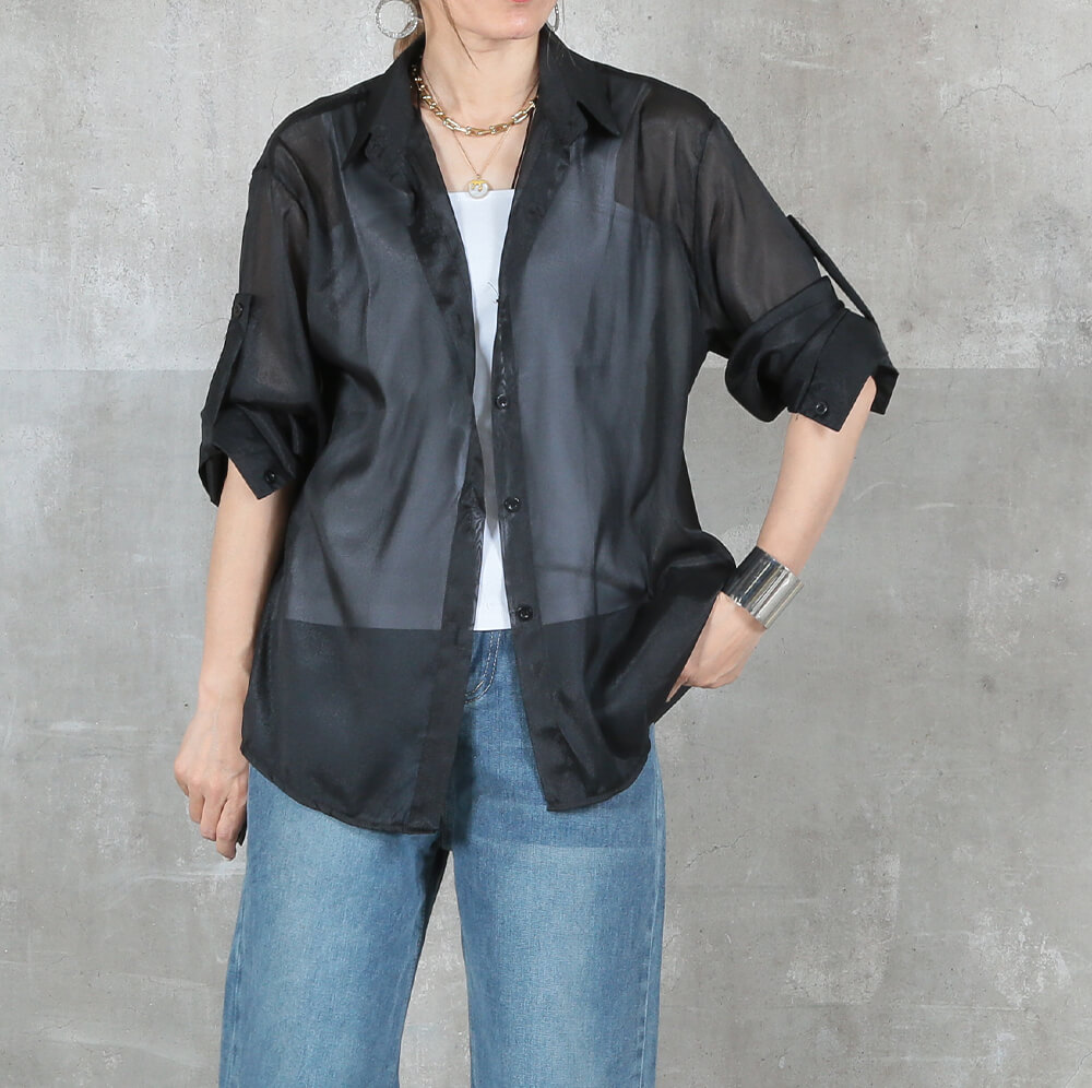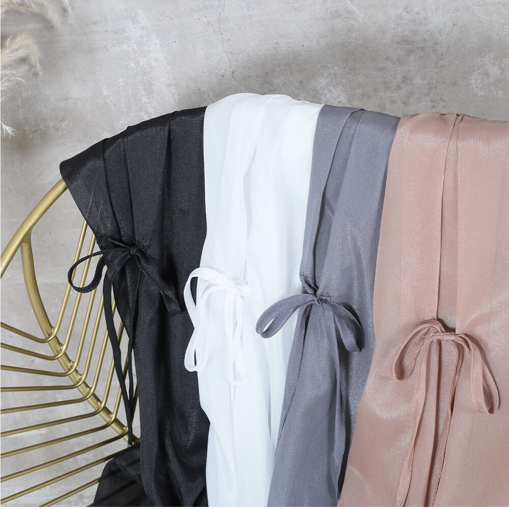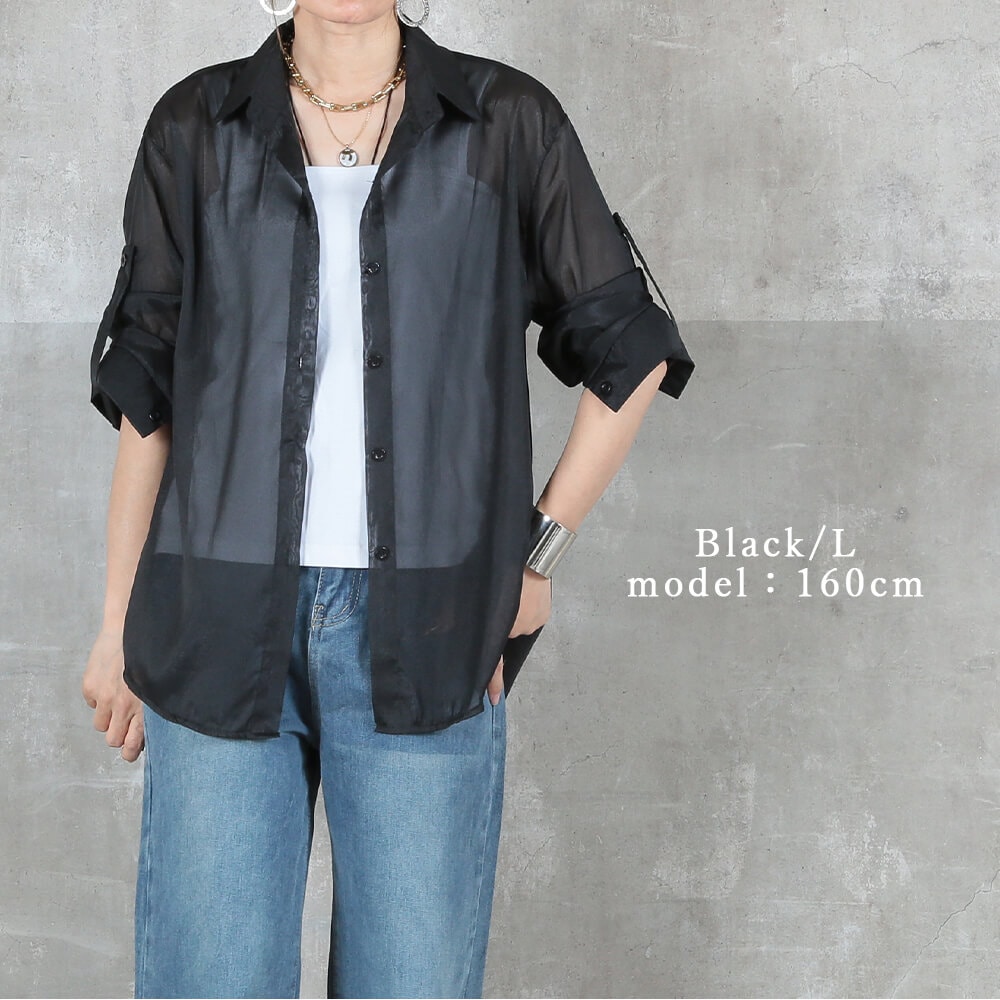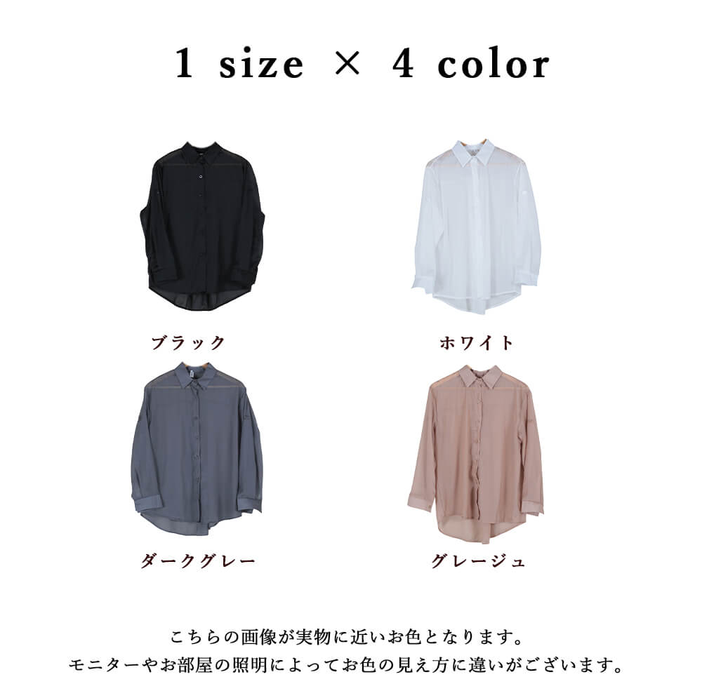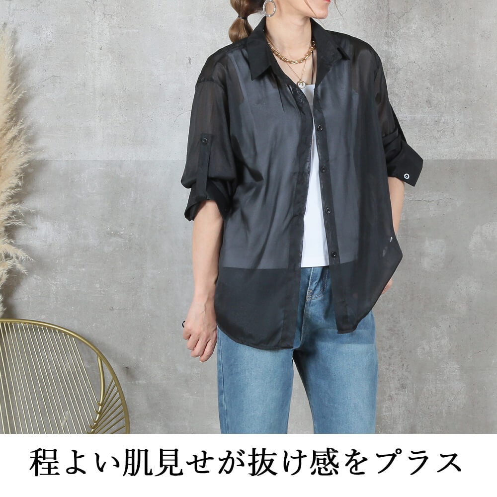 透け感のある軽やかなポリエステル素材で、羽織るだけで女性らしい抜け感スタイルに。背中部分のリボンでシルエットを調整でき、後ろ姿まで印象的に。長めの着丈とゆったり身幅で、体型カバーもしつつ軽やかにまとえる一枚です。