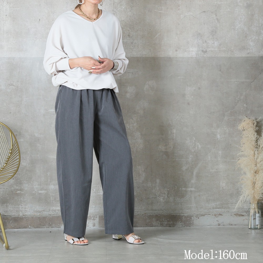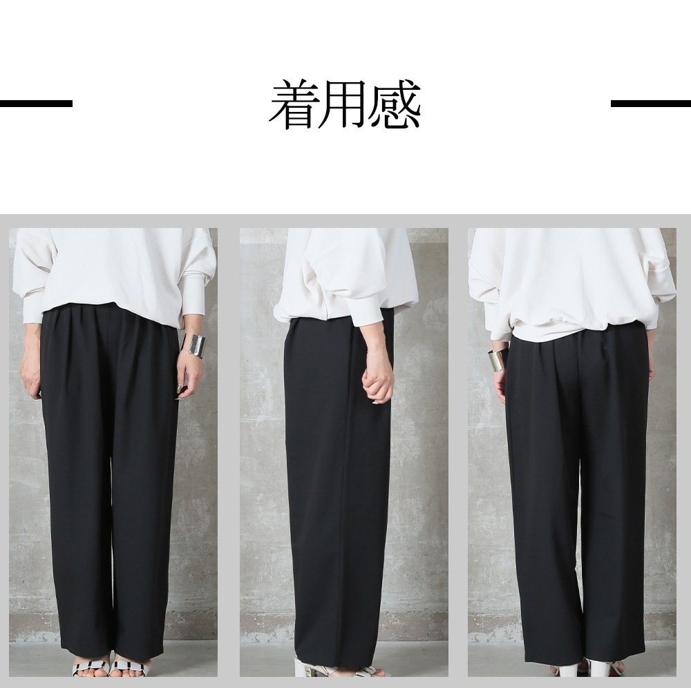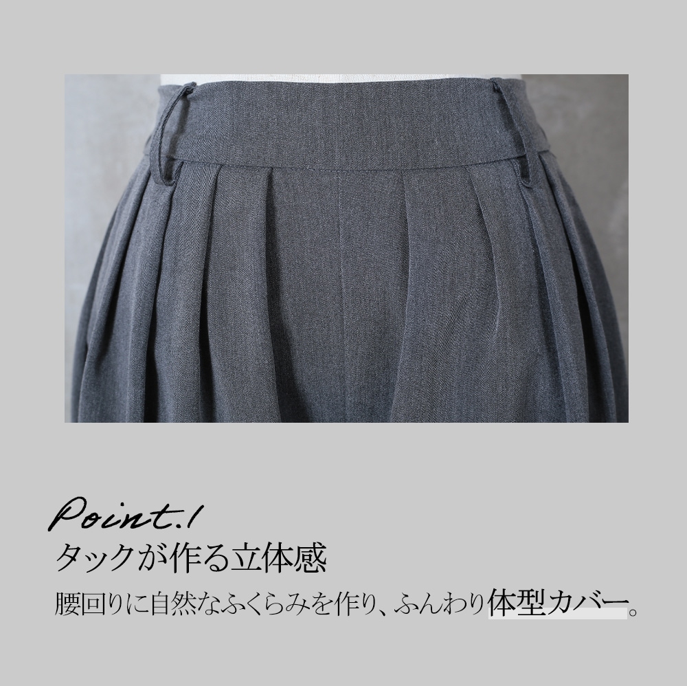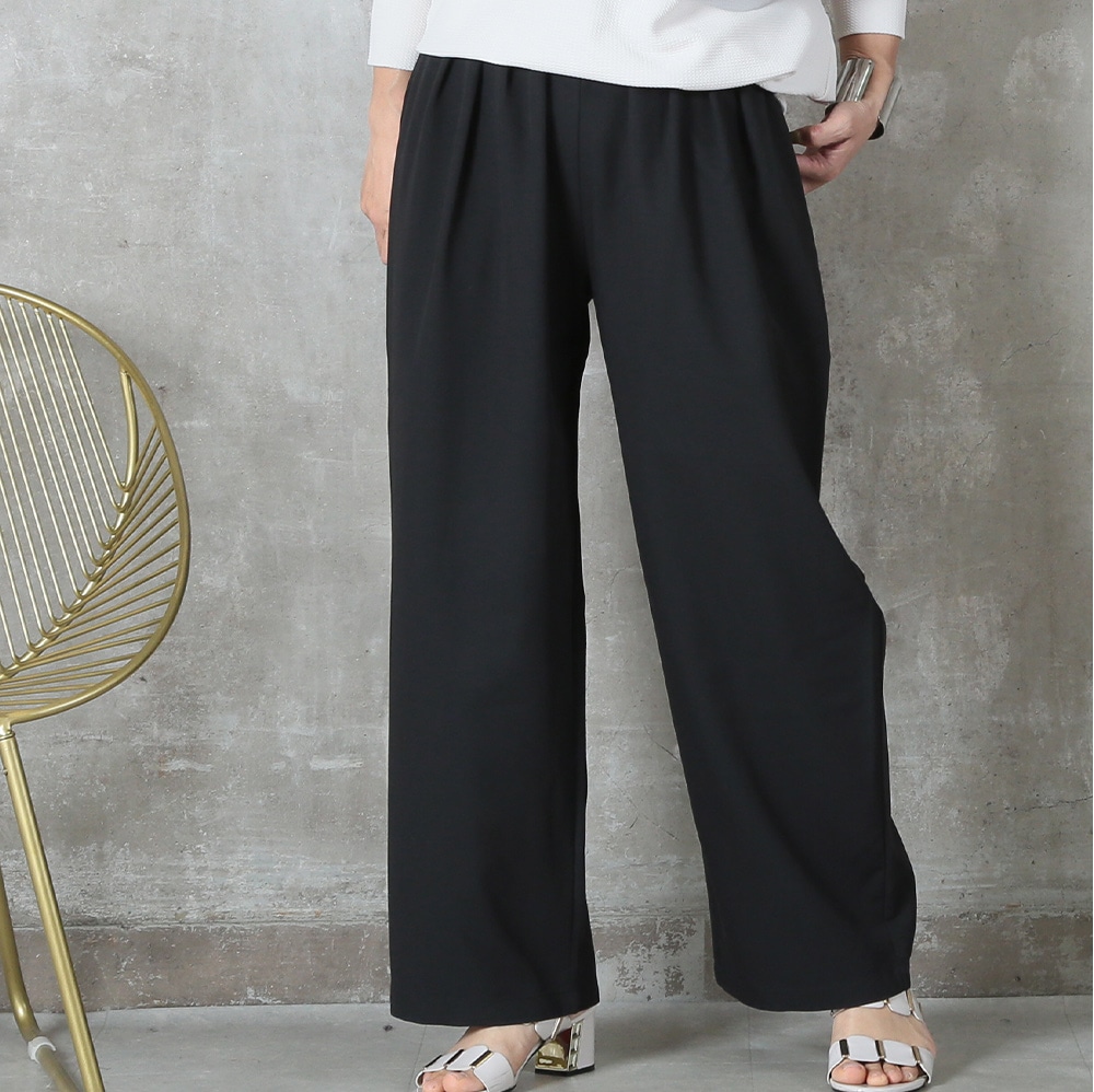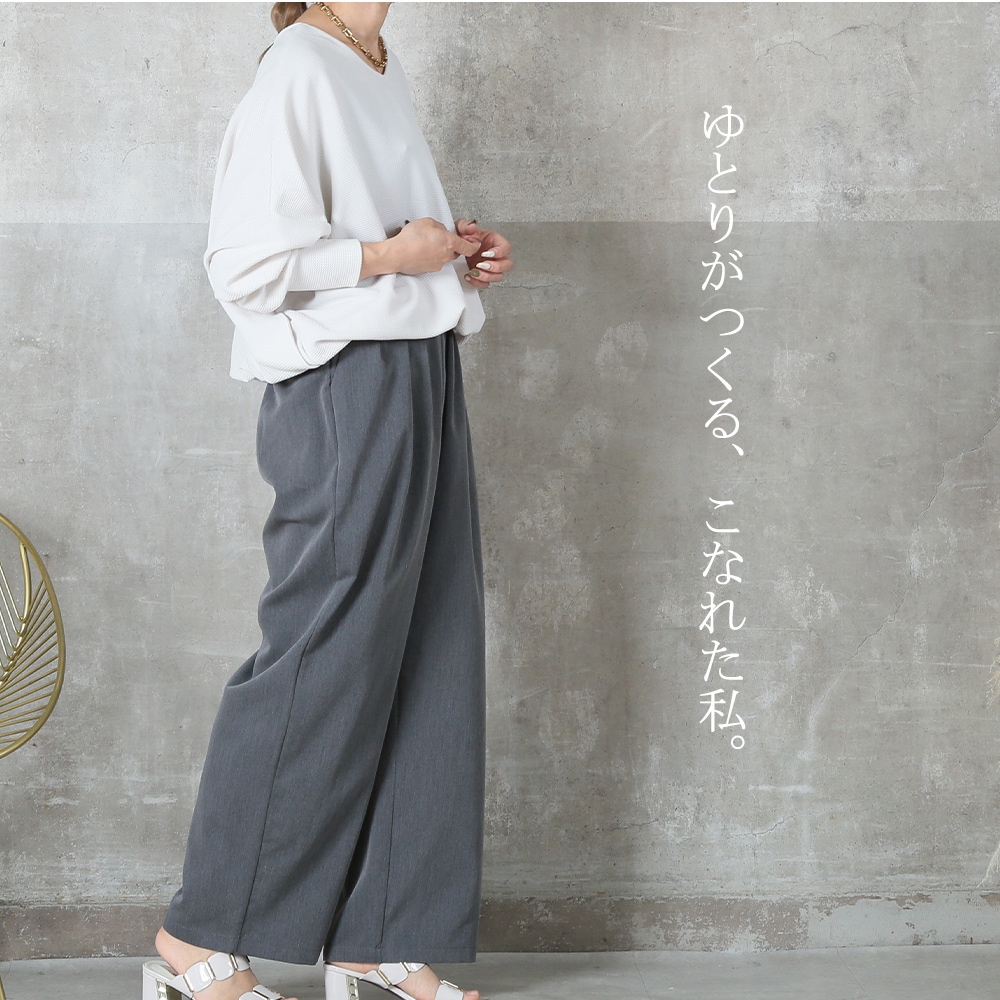 美しいタック入りのワイドパンツだから、ヒップまわりはゆったりなのに腰〜脚のラインをすっきり見せてくれる一枚。ウエストはバックゴムで楽な着脱が可能、さらにサイドのベルトループ&便利なポケット付きで実用性も高い。ポリエステル素材なのでシワになりにくく、毎日のお出かけに気負わず使えるのも嬉しい。