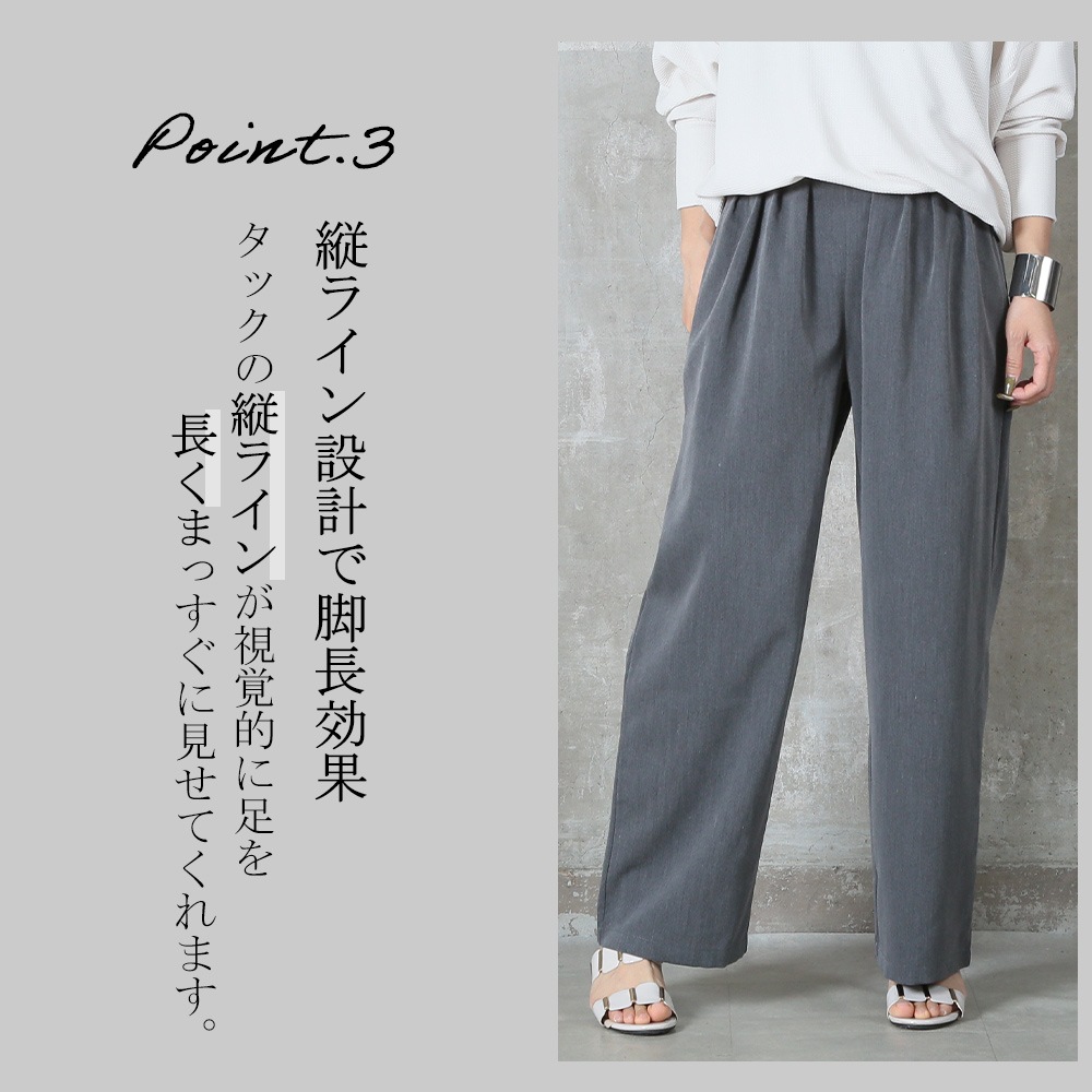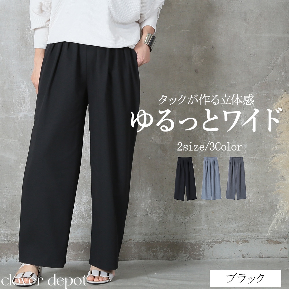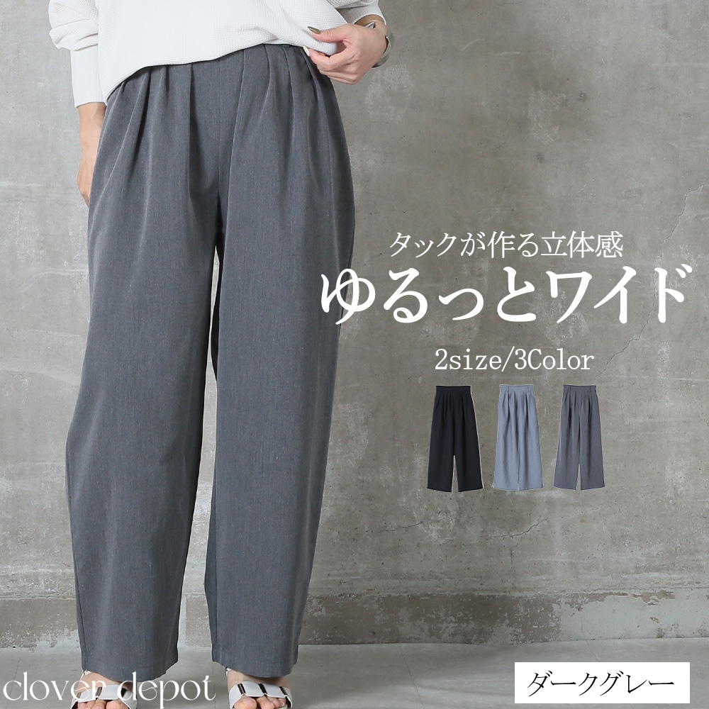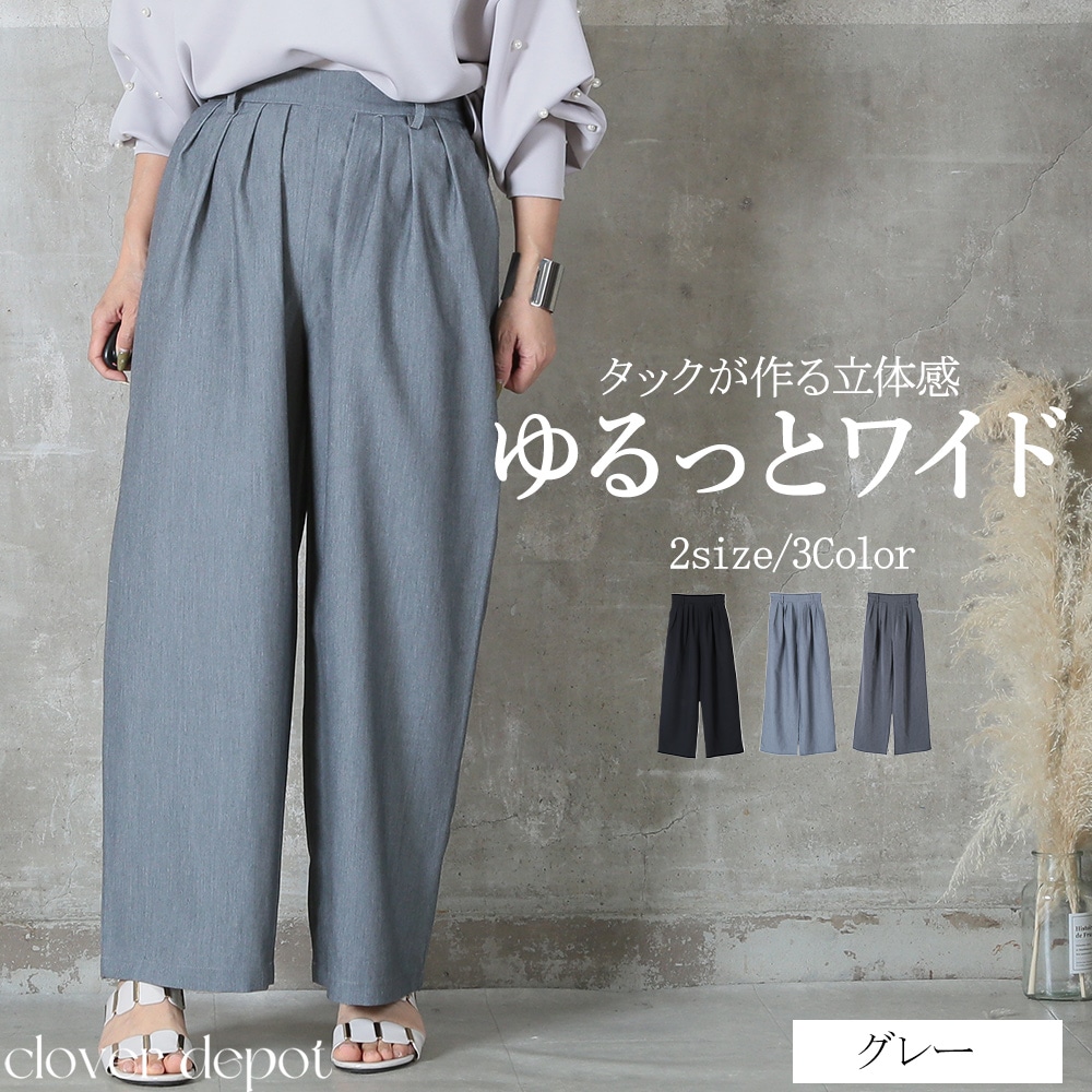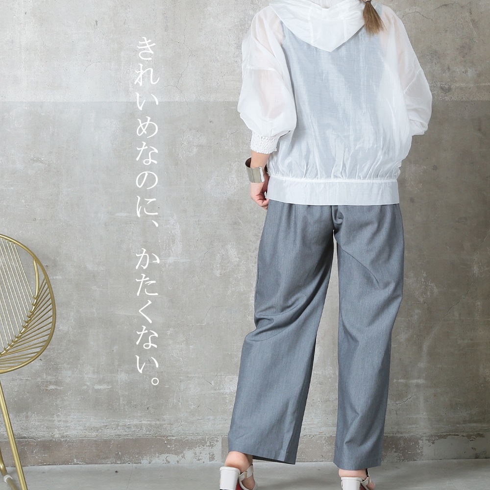 美しいタック入りのワイドパンツだから、ヒップまわりはゆったりなのに腰〜脚のラインをすっきり見せてくれる一枚。ウエストはバックゴムで楽な着脱が可能、さらにサイドのベルトループ&便利なポケット付きで実用性も高い。ポリエステル素材なのでシワになりにくく、毎日のお出かけに気負わず使えるのも嬉しい。